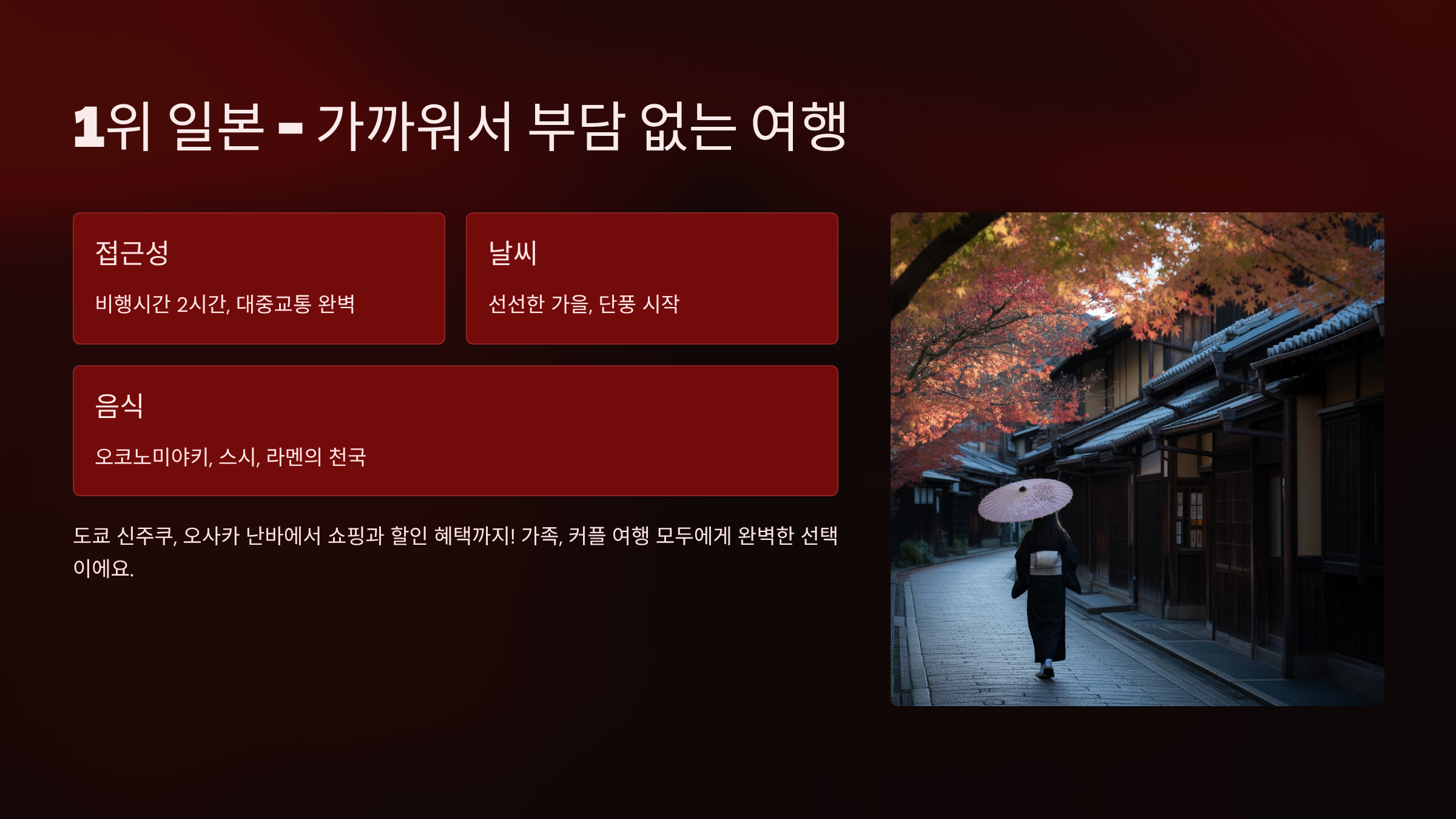 | 추천 지역 | 도쿄, 오사카, 교토, 후쿠오카 |