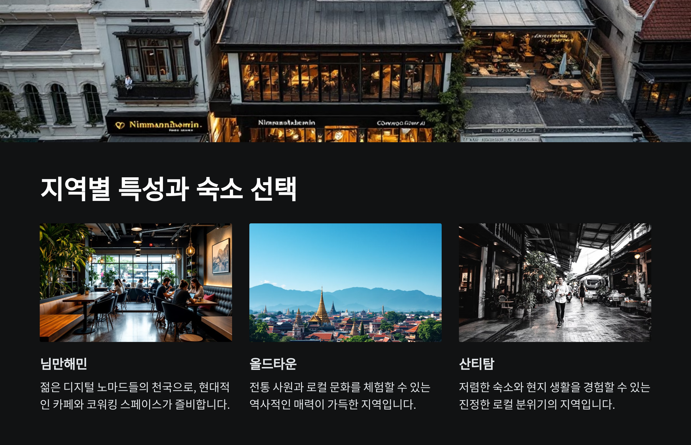 1. 님만해민 지역: 디지털 노마드와 젊은 여행자들에게 인기 있는 이곳은 트렌디한 카페, 레스토랑, 코워킹 스페이스가 많습니다. 가격대는 중간에서 높은 수준으로, 모던한 스타일의 아파트를 쉽게 찾을 수 있습니다.
