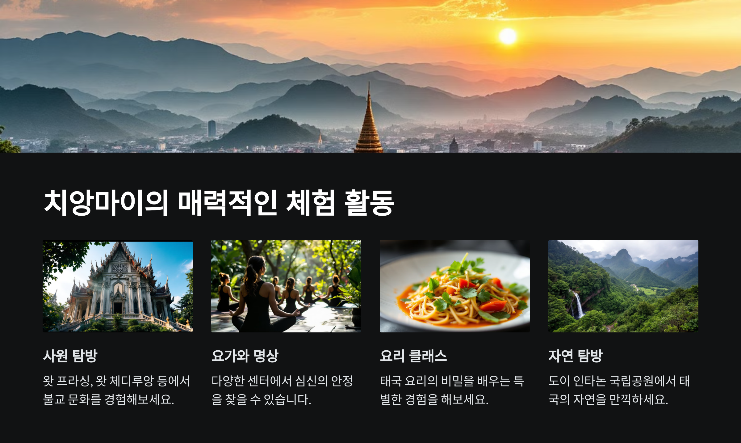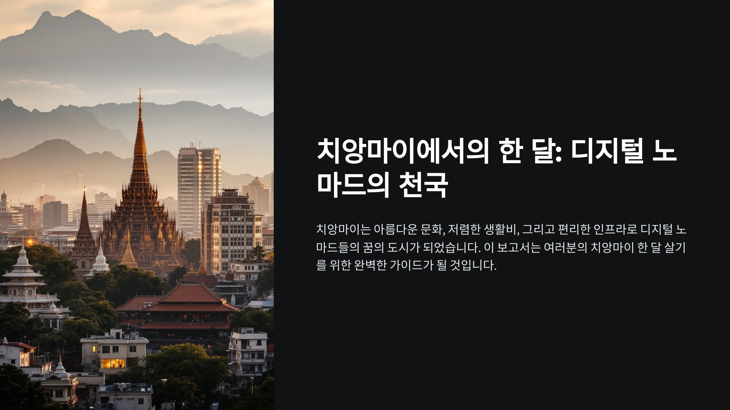 아래는 치앙마이에서 한 달 동안 살면서 즐길 수 있는 다양한 활동과 정보를 다룬 20개의 섹션입니다. 숙소 선택부터 즐길거리까지 하나씩 따라가며 준비해 보세요!
