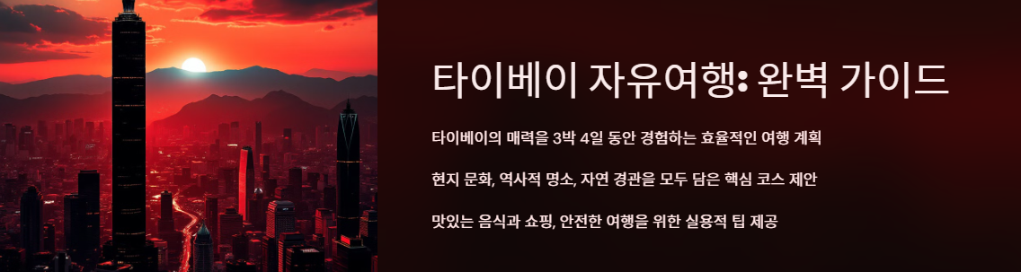 이 글에서는 타이베이를 처음 방문하거나 자유여행을 계획 중인 여행자들을 위해 필수 관광지, 숨겨진 명소, 추천 음식, 효율적인 교통 이용법, 여행 팁 등을 상세히 소개합니다. 3박 4일 기준의 자유일정으로 구성했지만, 필요에 따라 일정을 조정할 수 있습니다.