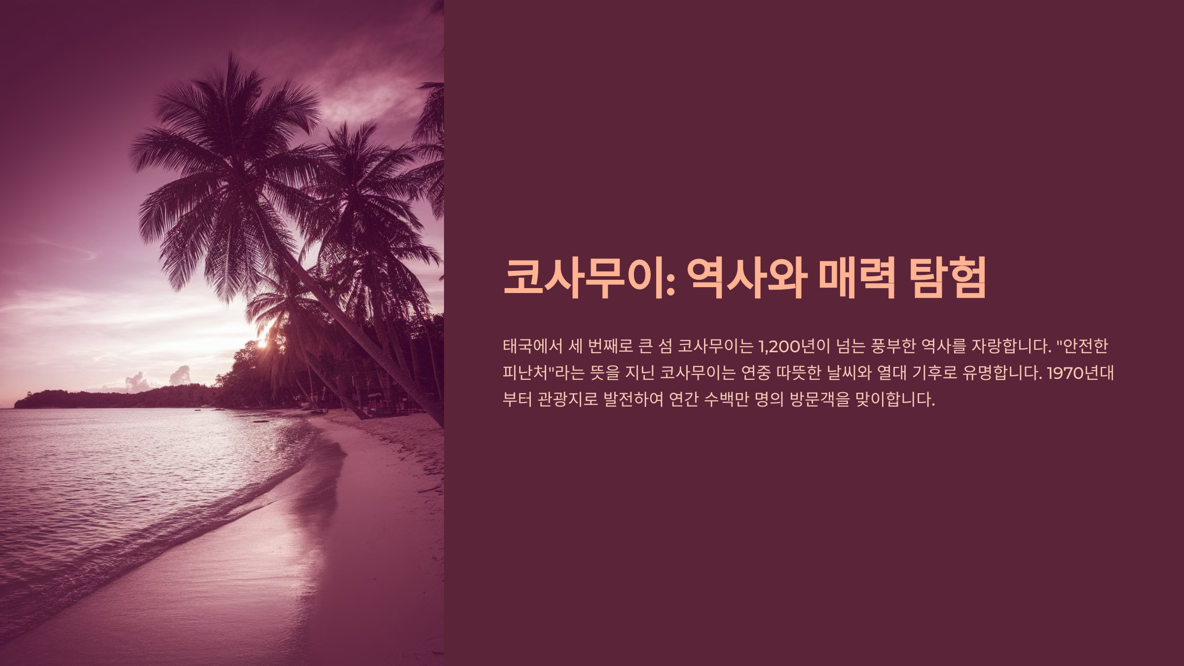 내가 생각했을 때, 코사무이는 단순한 휴양지가 아니라 자연과 문화를 동시에 즐길 수 있는 완벽한 여행지예요. 이제부터 코사무이의 매력을 하나씩 알아볼까요? 😍