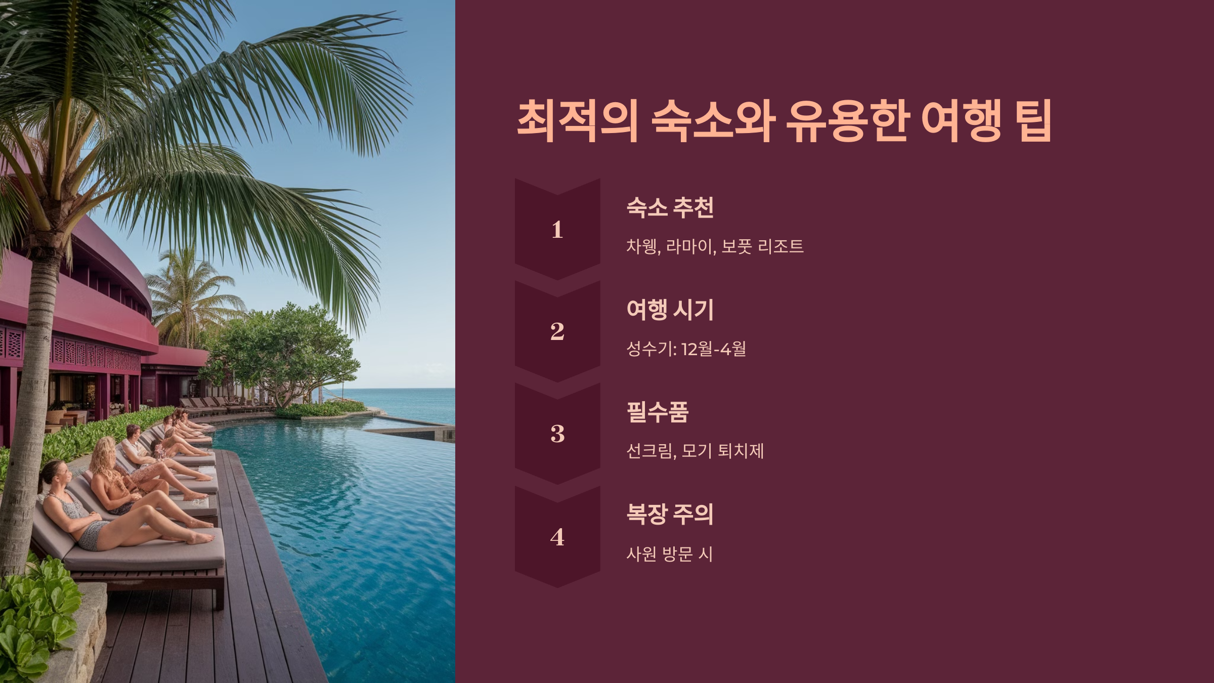 코사무이는 다양한 숙소 옵션이 있어서 여행 스타일에 따라 선택할 수 있어요. 럭셔리 리조트부터 가성비 좋은 게스트하우스까지, 여행자의 예산과 목적에 맞는 숙소가 많답니다. 특히 해변과 가까운 숙소를 찾는다면 차웽 비치나 라마이 비치 근처가 좋아요.