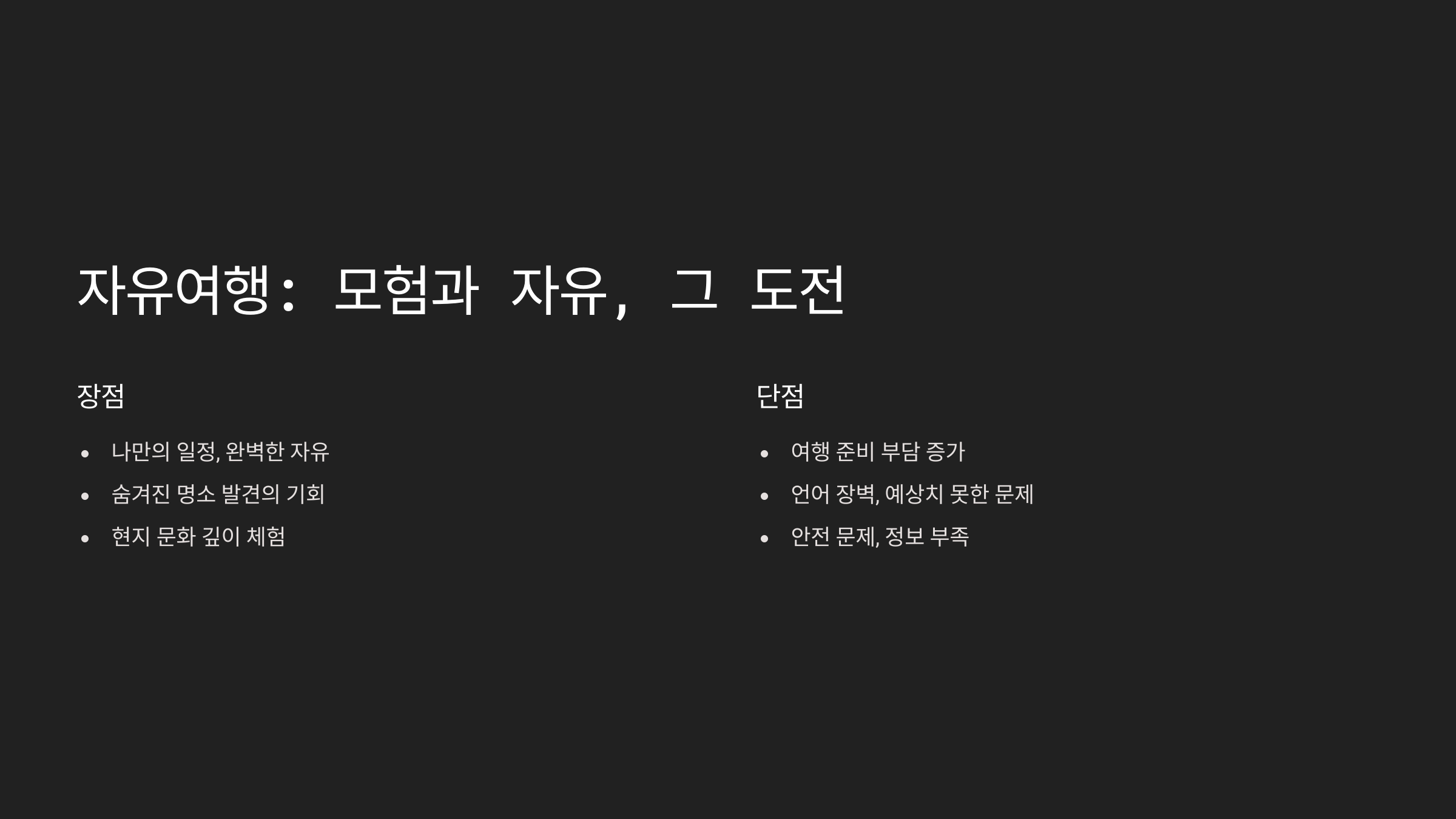 | 편의성 | 숙소 및 이동 수단 직접 선택 가능 | 모든 것을 혼자 해결해야 함 |