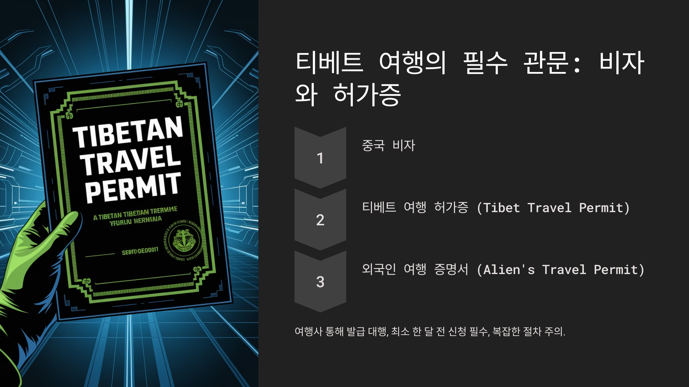 티베트에 들어가기 위해선 추가적으로 티베트 여행 허가증(TTP, Tibet Travel Permit)을 발급받아야 해요. 이 허가증은 개인이 직접 신청할 수 없고, 반드시 티베트 현지 여행사를 통해서만 발급 가능하다는 점이 중요해요. 📝