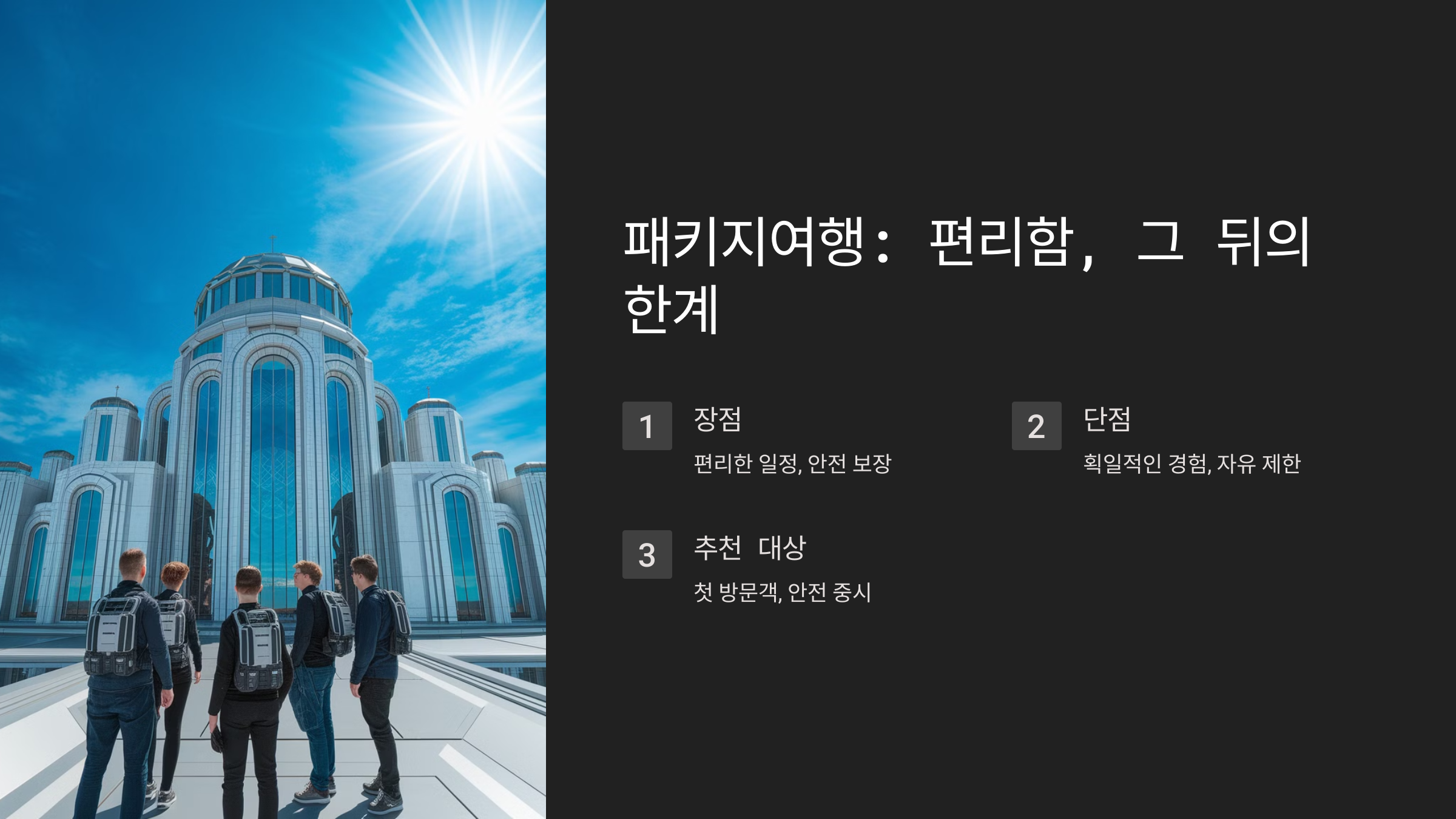 | 편리함 | 모든 예약 및 절차 대행 | 일정이 고정됨 |