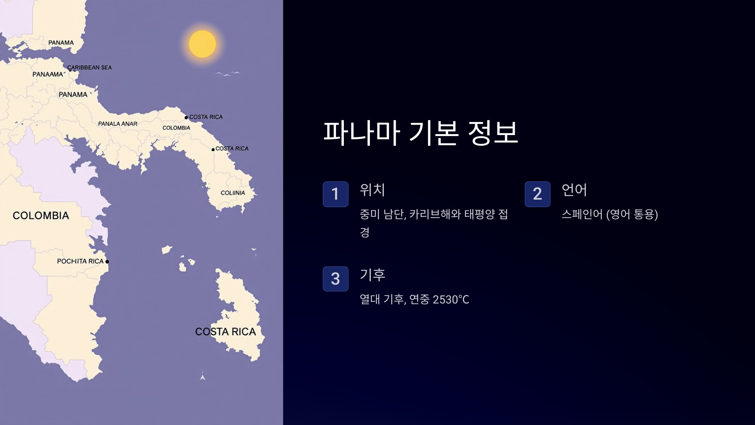 파나마는 중미의 남단에 위치한 나라로, 북쪽으로는 카리브해, 남쪽으로는 태평양과 접하고 있습니다. 동쪽으로는 콜롬비아, 서쪽으로는 코스타리카와 국경을 맞대고 있죠. 면적은 약 75,000㎢로, 한국보다 조금 작은 크기입니다. 인구는 약 400만 명으로, 수도는 파나마시티(Panama City)입니다.