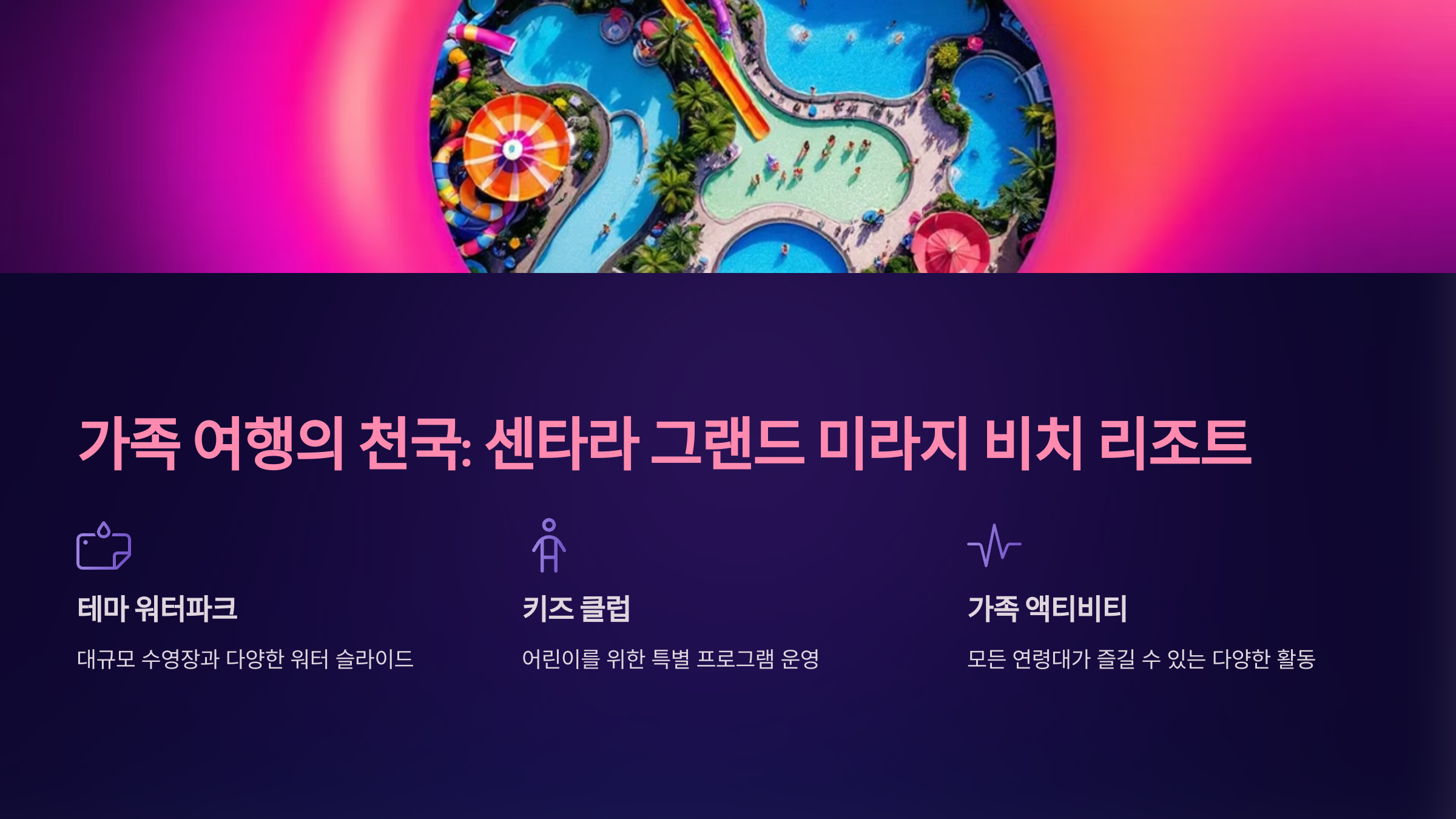 가족 여행객에게 가장 추천하는 리조트 중 하나입니다. 워터파크 스타일의 수영장과 다양한 키즈 프로그램이 준비되어 있어 아이들과 함께 즐기기에 최적입니다.