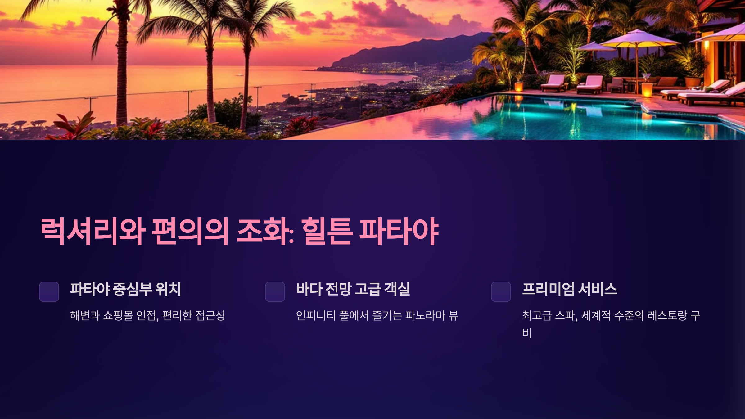 파타야는 태국의 대표적인 관광지로, 아름다운 해변과 다양한 즐길 거리, 그리고 세계적으로 유명한 리조트들이 모여 있는 곳입니다. 특히, 이 지역은 럭셔리부터 가성비 좋은 옵션까지 모든 여행자에게 맞는 숙소를 제공합니다.