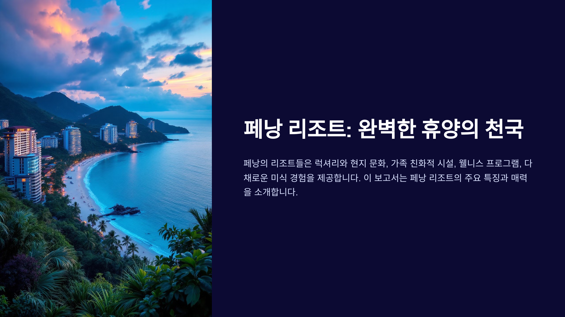말레이시아 페낭은 자연과 현대적인 편의 시설이 조화를 이루는 여행지로 유명합니다. 특히 페낭 리조트는 가족, 커플, 또는 혼자 여행하는 이들 모두에게 매력적인 선택지를 제공합니다. 럭셔리한 숙소와 아름다운 해변, 다양한 액티비티가 어우러져 최고의 휴양을 즐길 수 있습니다.