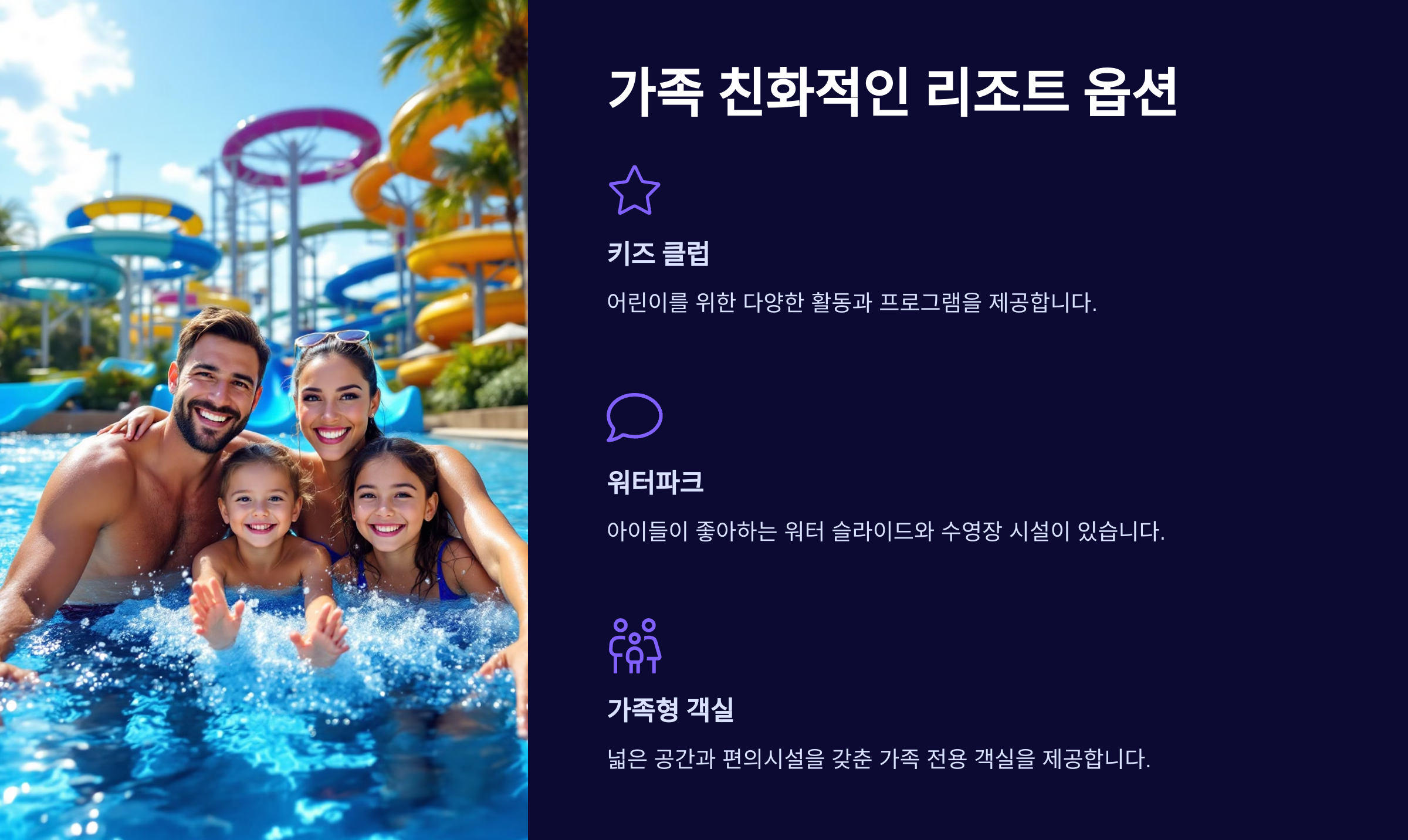 아이들이 즐길 수 있는 프로그램이 있는 리조트는 부모가 더욱 편안하게 휴식을 취할 수 있게 해줍니다. 특히 워터파크나 놀이 시설이 있는 리조트를 추천합니다.