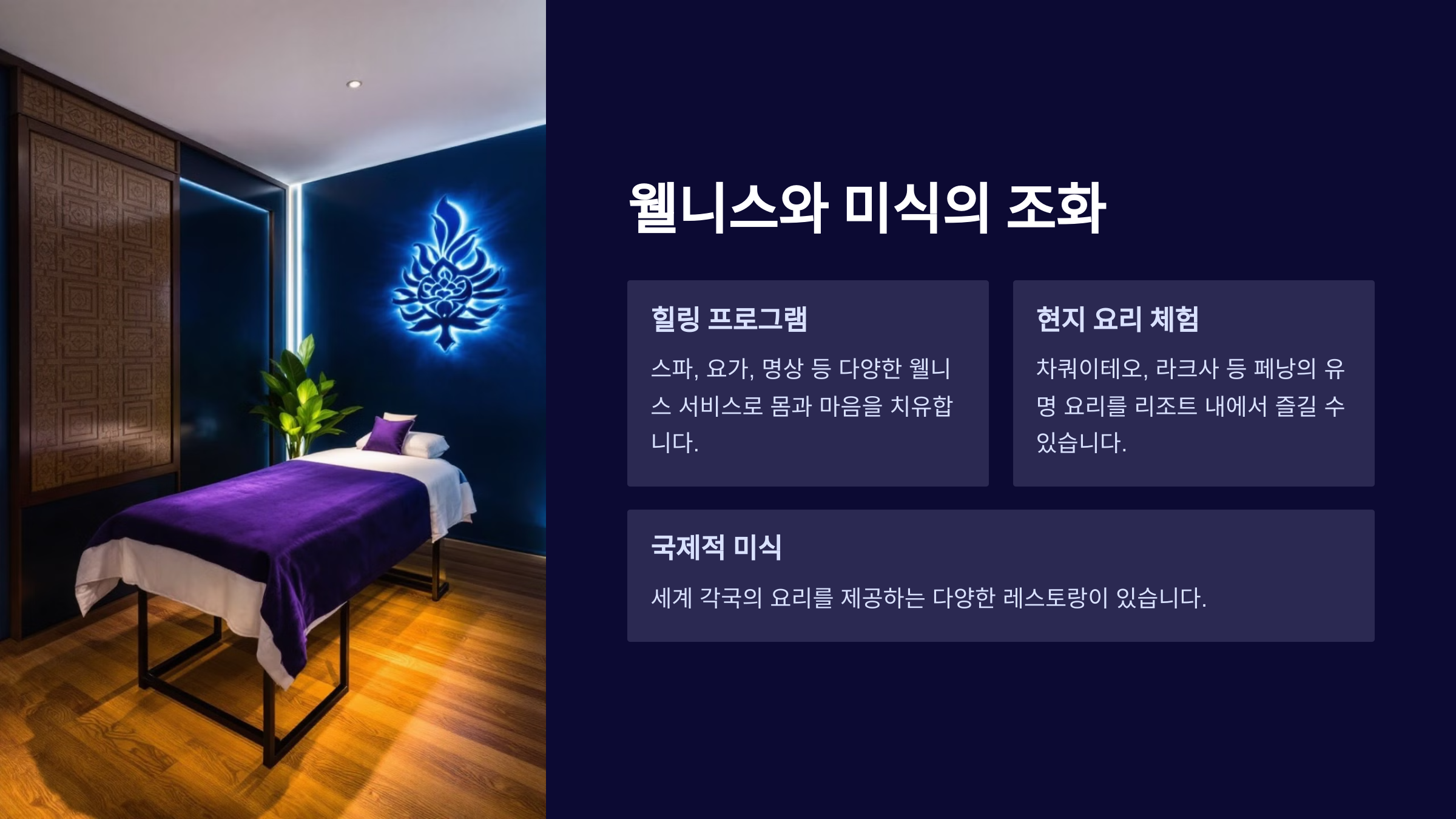 페낭 리조트는 다양한 웰니스 서비스를 제공합니다. 스파 트리트먼트와 요가 프로그램은 물론, 전통 마사지와 아로마테라피도 체험할 수 있습니다. 휴양 중에도 건강과 힐링을 중시하는 여행객들에게 이상적입니다.