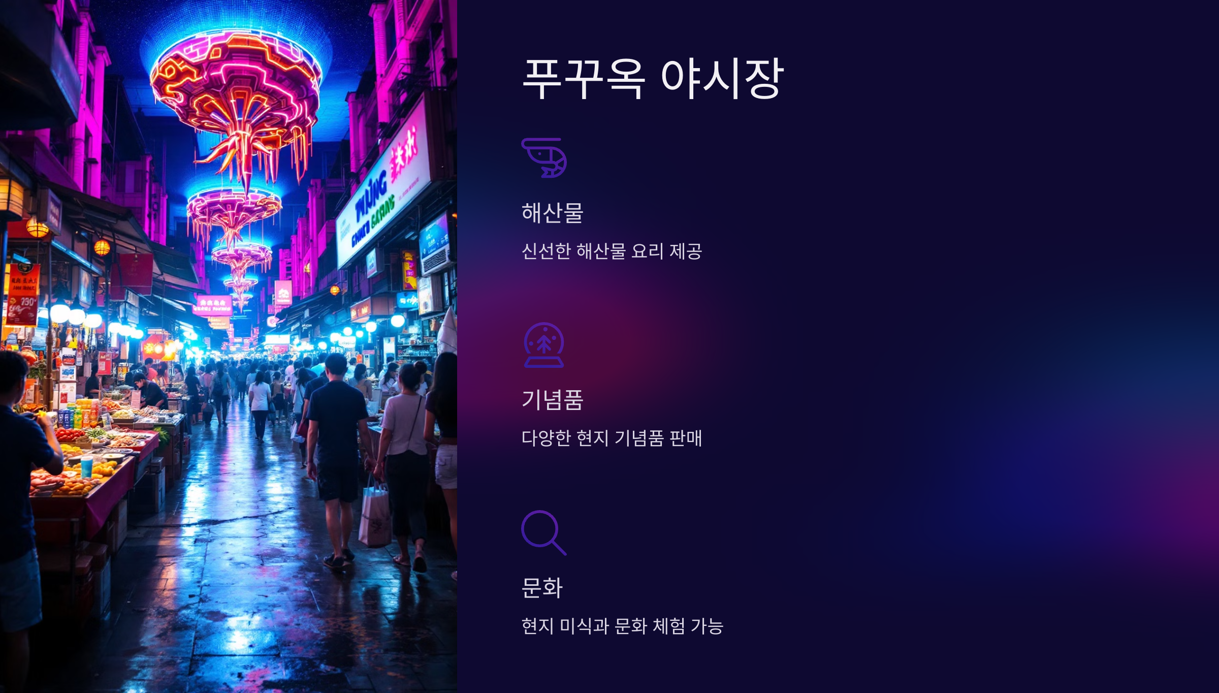 푸꾸옥 야시장은 다양한 해산물 요리와 현지 기념품을 판매하며, 현지 문화를 체험하기에 좋은 장소입니다.