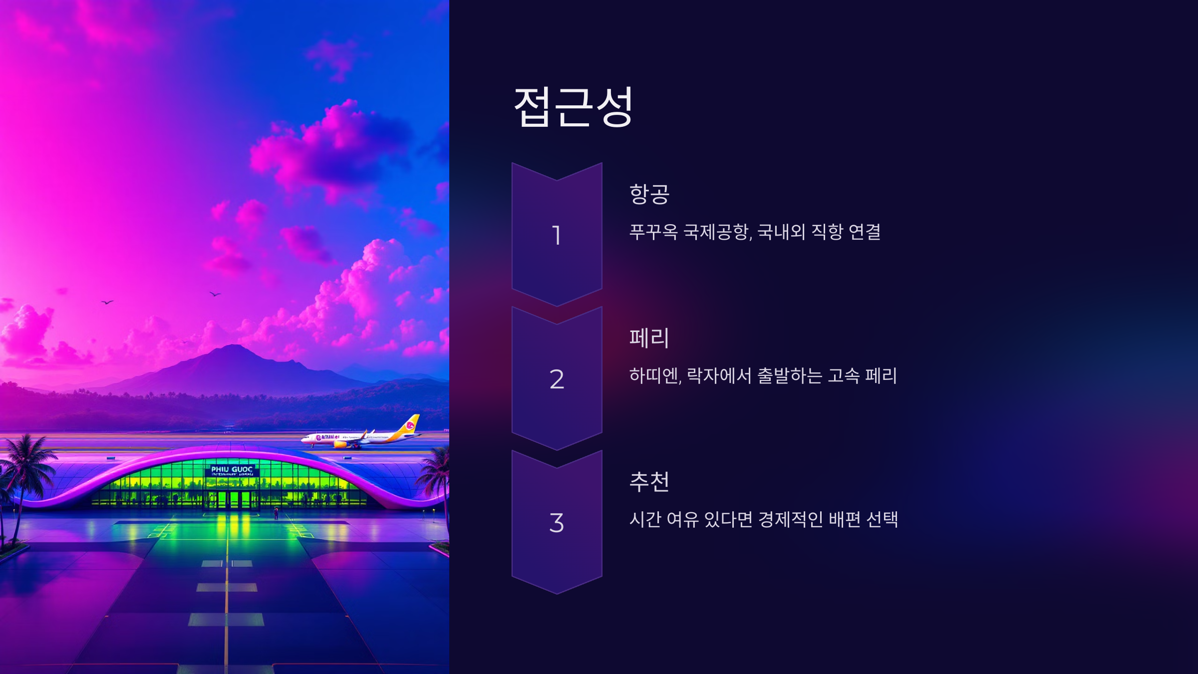 푸꾸옥 섬은 뛰어난 접근성 덕분에 다양한 교통수단으로 방문할 수 있습니다.