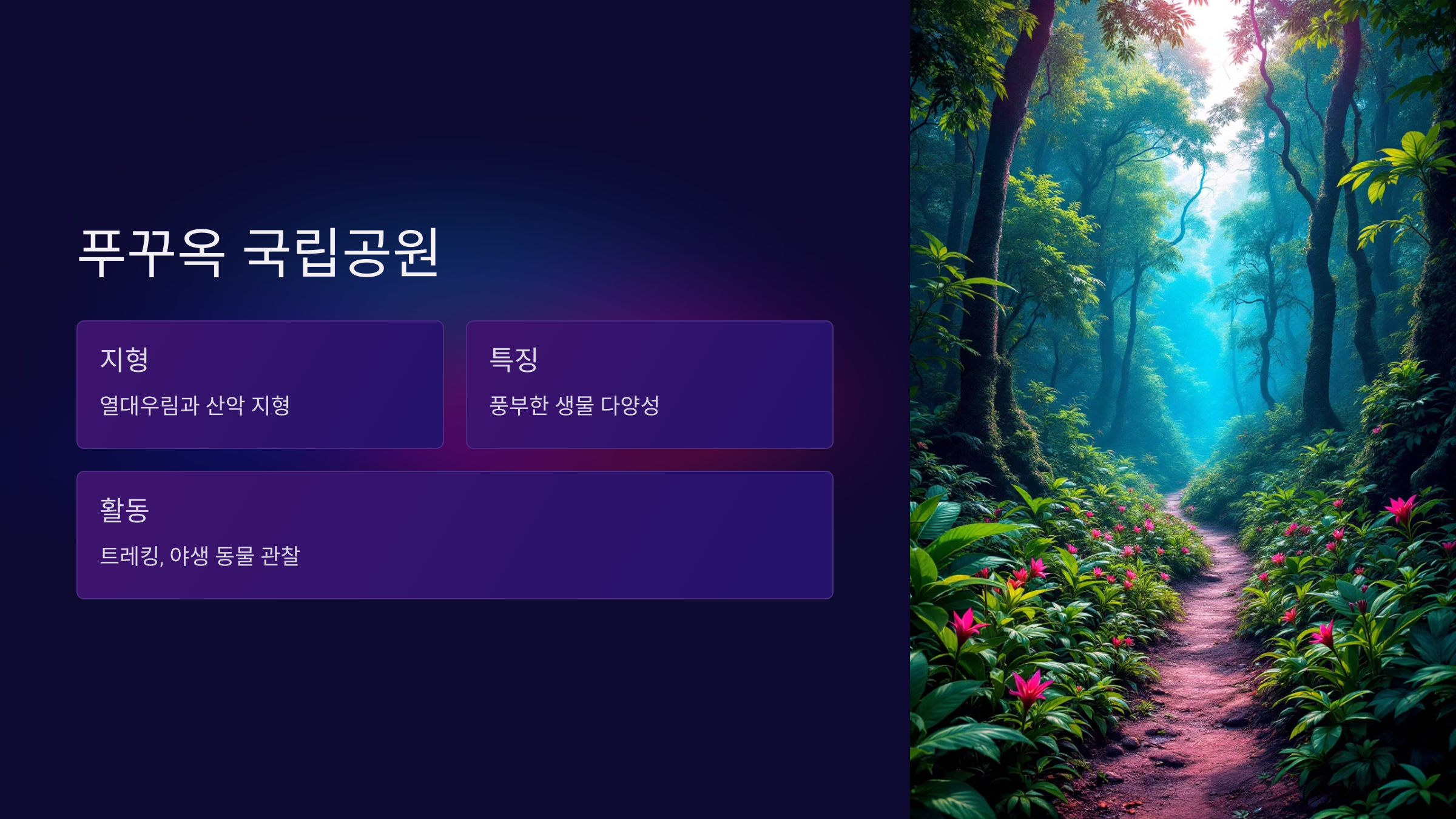 푸꾸옥 국립공원은 울창한 열대우림과 드넓은 산악 지형을 갖추고 있어 자연을 사랑하는 사람들에게 천국과 같은 곳입니다. 트레킹이나 캠핑을 통해 이 지역의 생태계를 직접 체험할 수 있습니다.