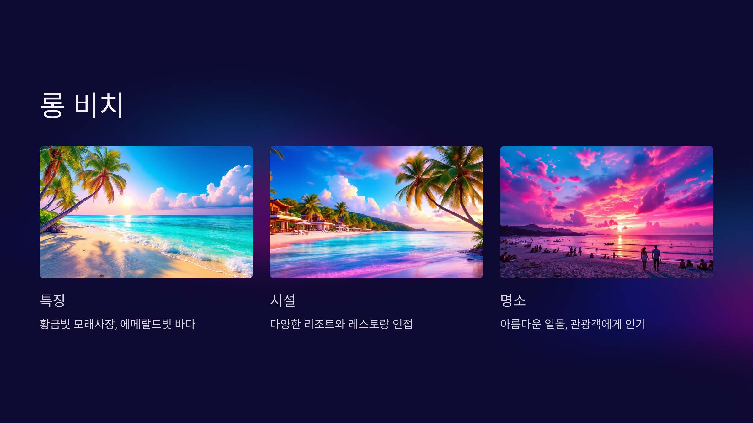 푸꾸옥 섬의 대표 해변인 롱 비치는 황금빛 모래사장과 맑고 푸른 바닷물로 유명합니다. 해변을 따라 자리 잡은 레스토랑과 카페에서 맛있는 식사와 음료를 즐길 수 있으며, 일몰 시간의 풍경은 그야말로 장관입니다.