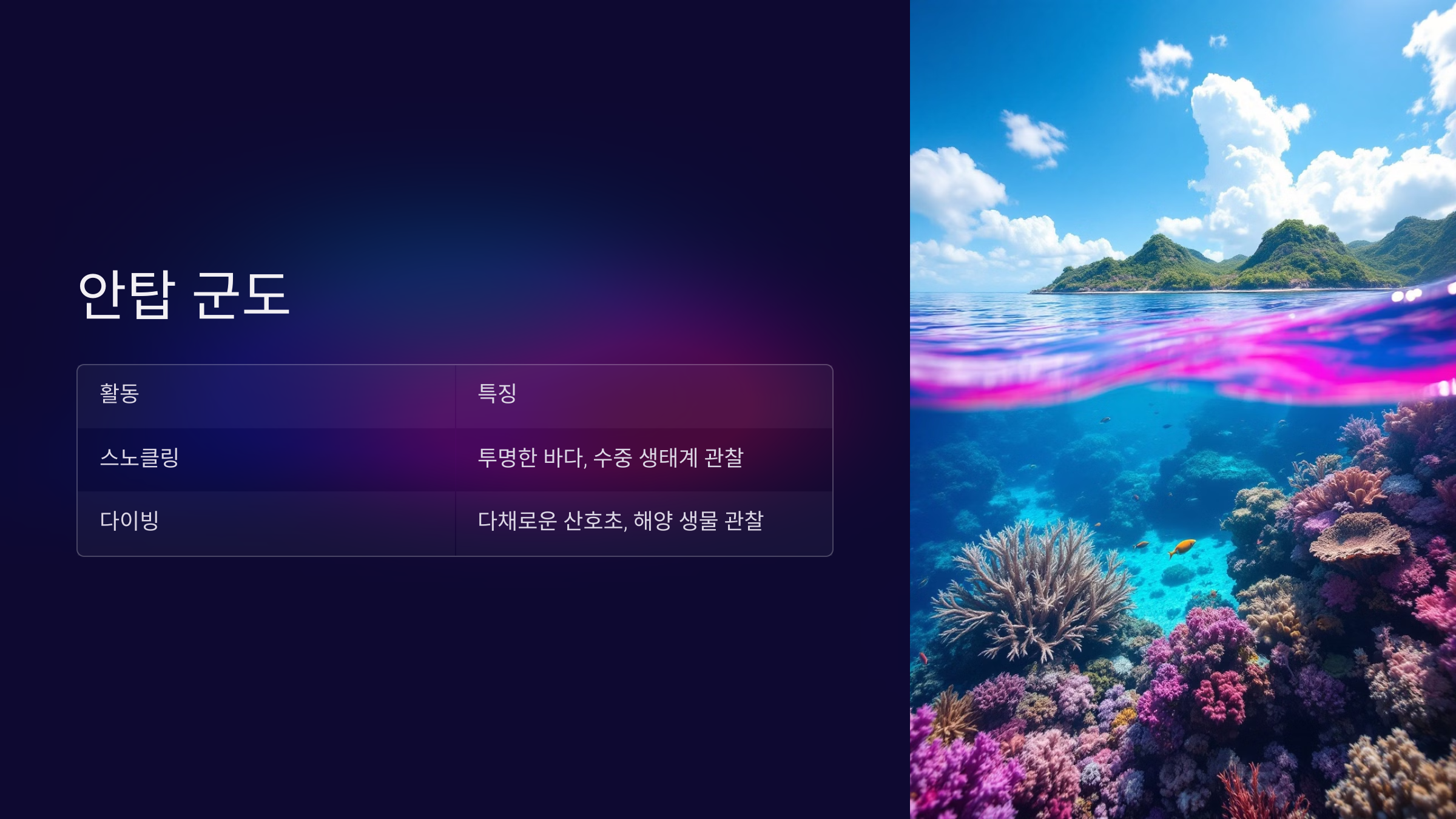 스노클링, 다이빙, 낚시와 같은 수상 스포츠가 인기 있습니다. 특히 안탑 군도 주변에서 스노클링을 추천합니다.