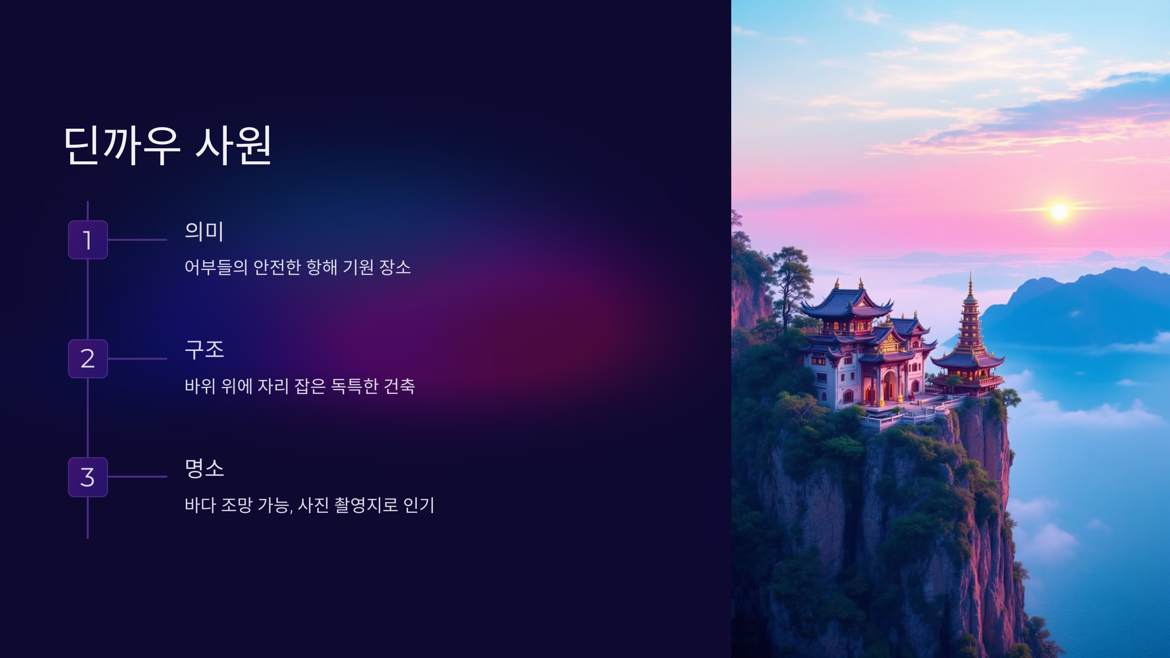 푸꾸옥 섬의 문화적 상징 중 하나로, 어부들이 항해의 안전을 기원하며 찾는 신성한 장소입니다. 이곳은 바다를 내려다볼 수 있는 독특한 위치 덕분에 사진 명소로도 인기가 높습니다.