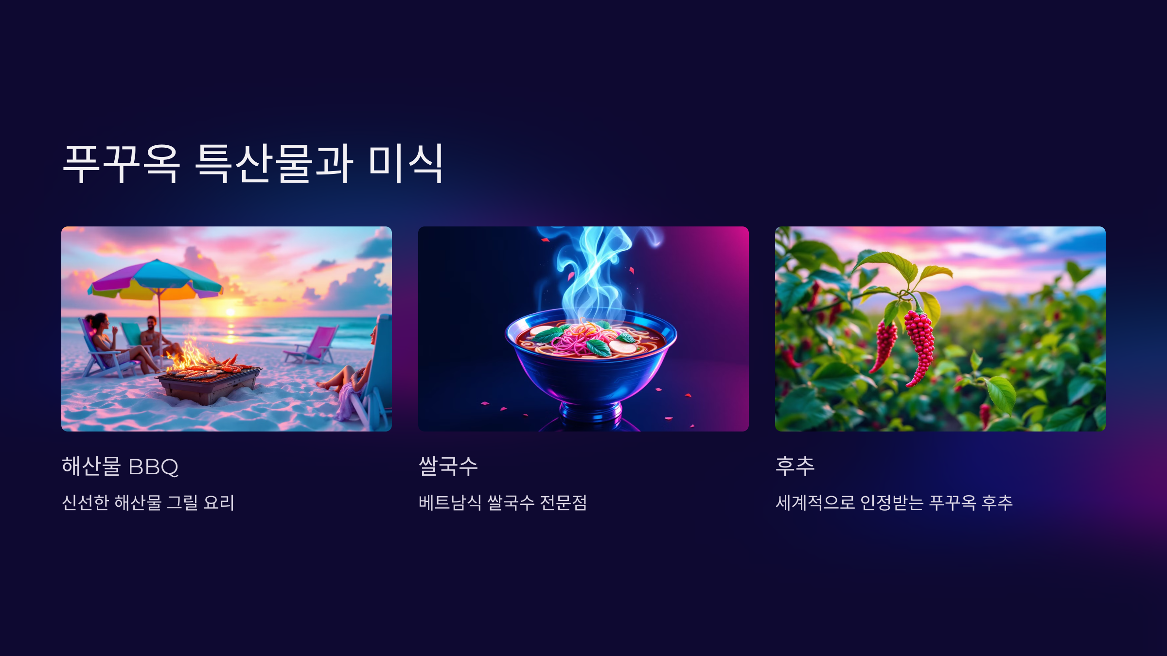 푸꾸옥 섬은 미식 여행지로도 유명합니다. 신선한 해산물과 섬의 특산물로 만든 요리는 그 자체로 여행의 즐거움을 더해줍니다.