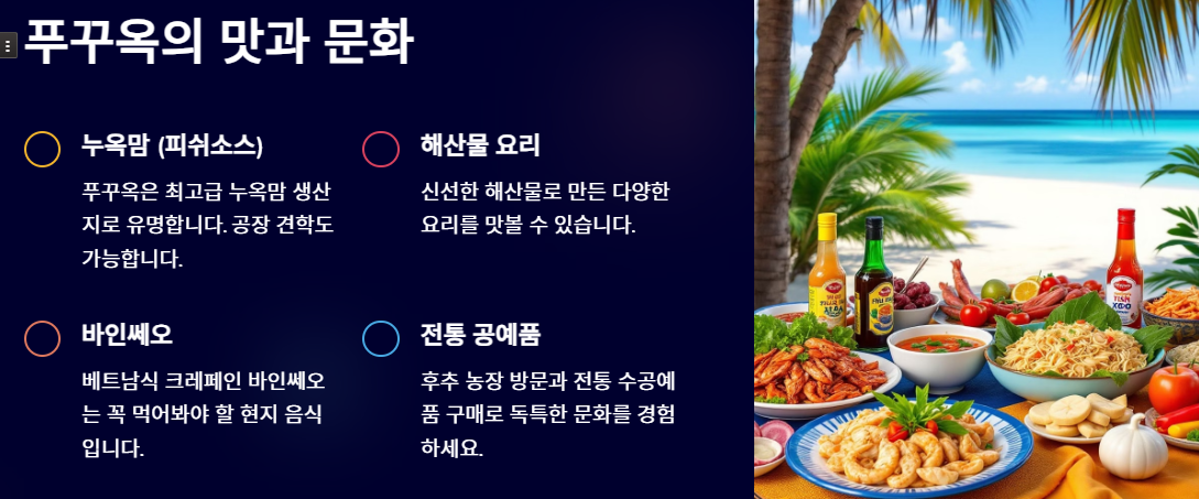• 현지 음식 투어: 바인쎄오, 해산물 쌀국수 등 푸꾸옥만의 특별한 맛을 즐기세요.