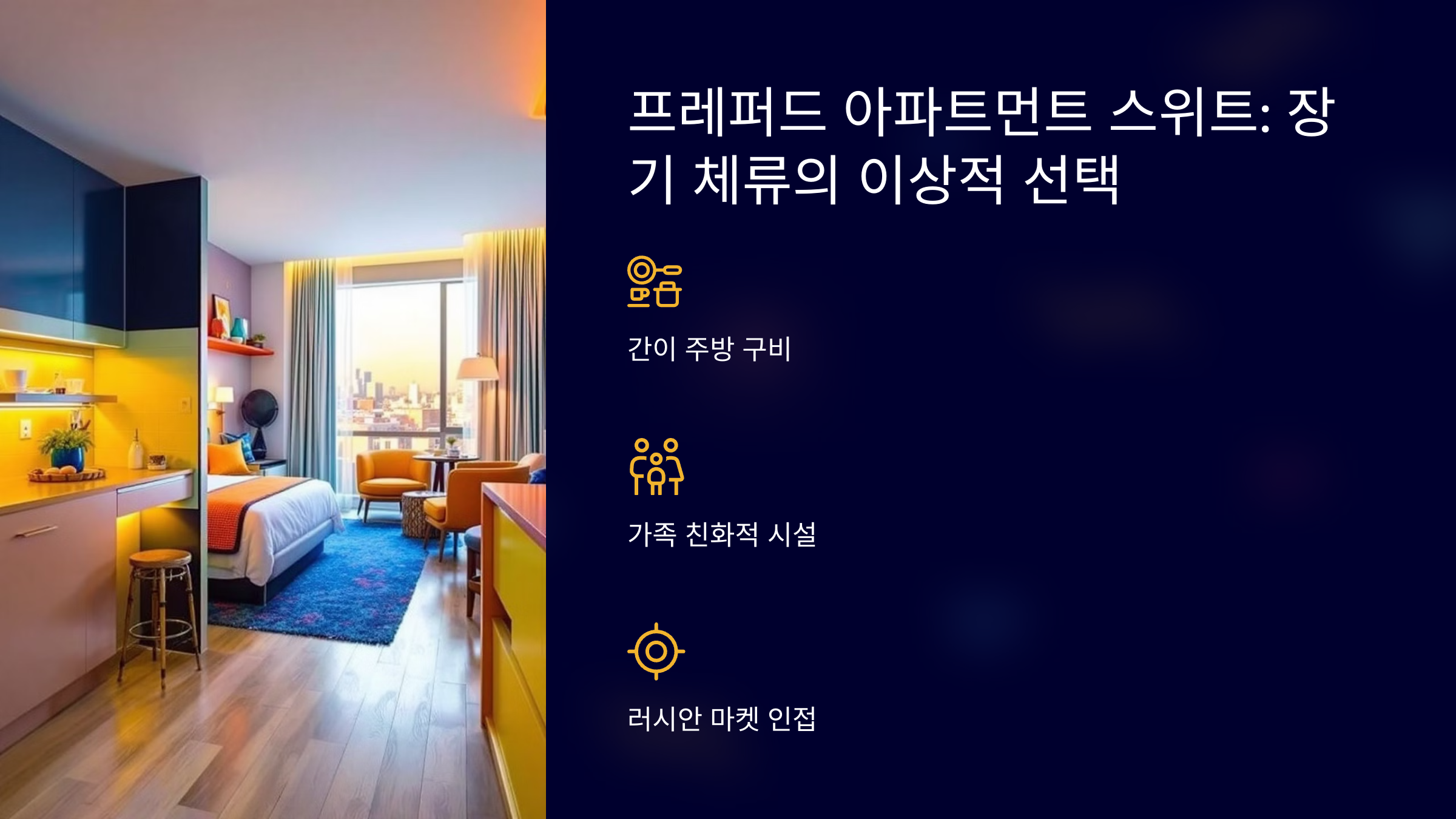 - 특징: 간이 주방이 포함된 넓은 객실, 가족을 위한 편의시설.