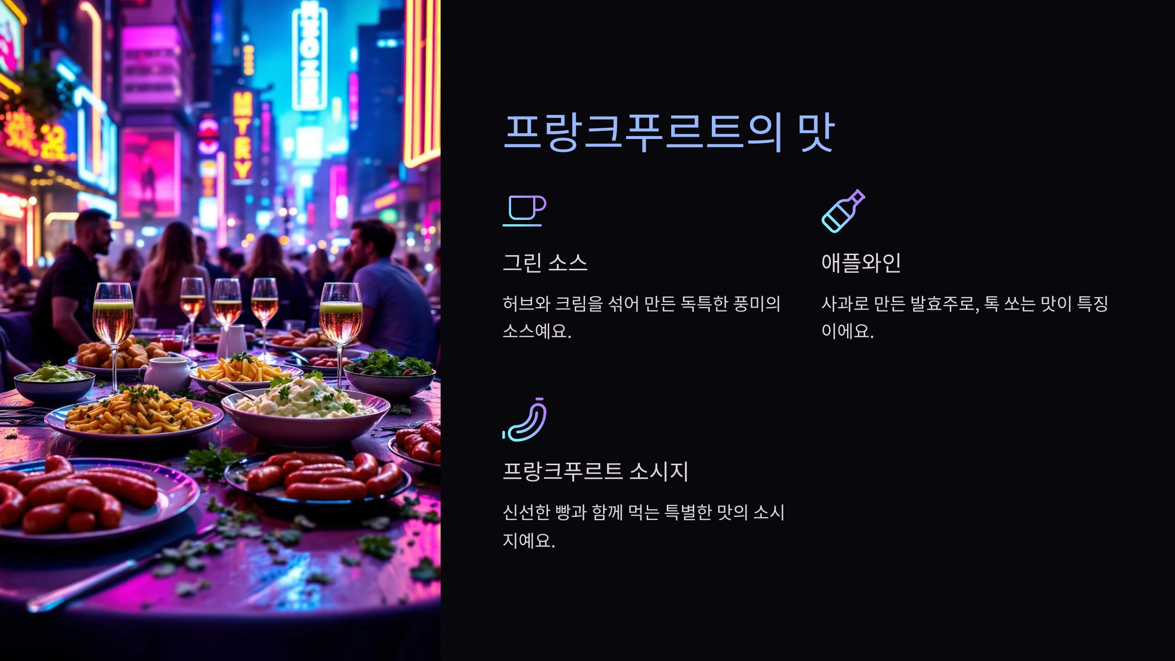 A5. 그린 소스와 프랑크푸르트 소시지, 애플와인과 함께 먹는 현지 요리를 추천해요.