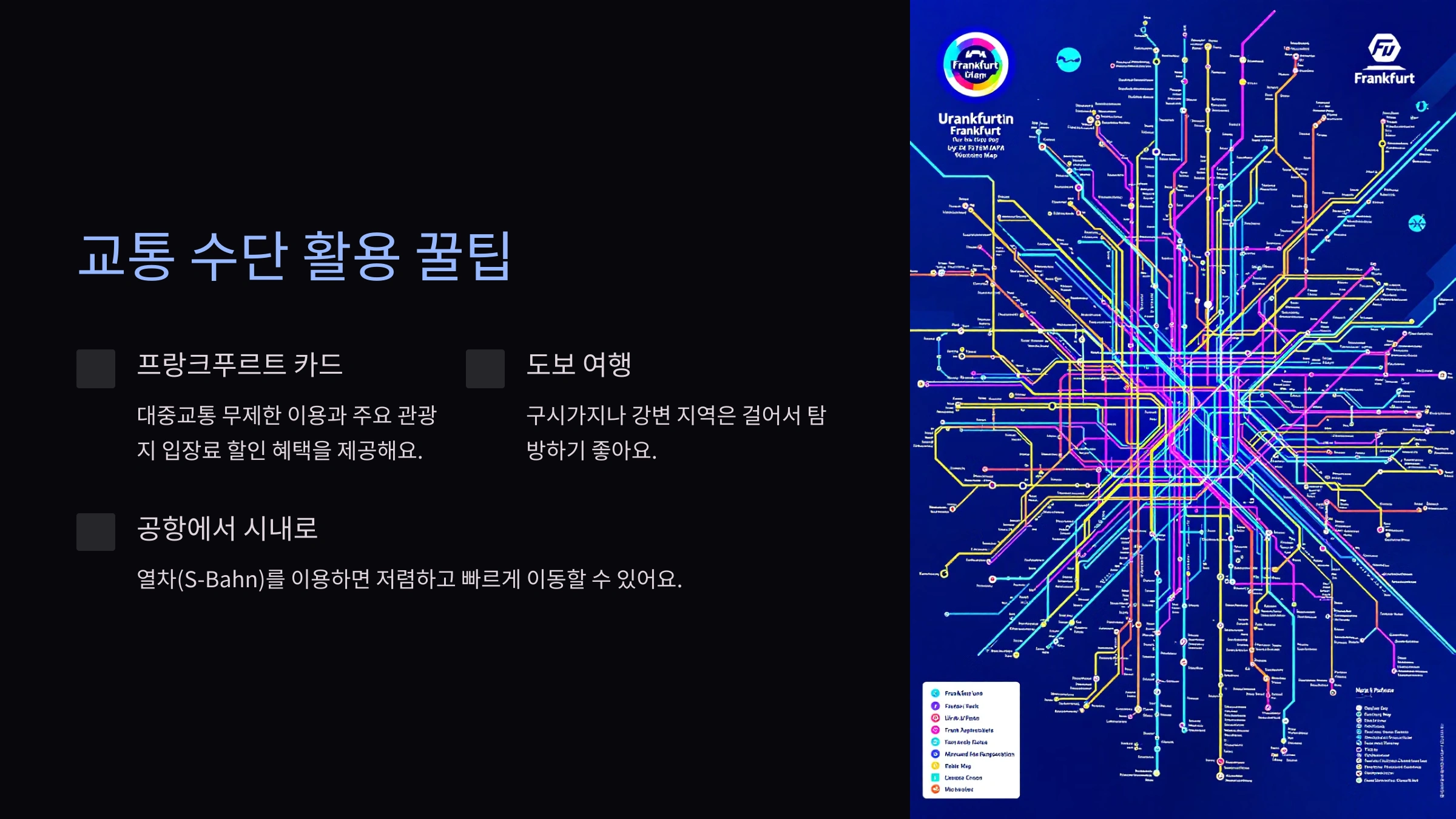 단기간 여행을 계획 중이라면 프랑크푸르트 카드(Frankfurt Card)를 구매하는 게 좋아요. 이 카드는 대중교통 무제한 이용뿐만 아니라 주요 관광지 입장료 할인 혜택도 제공하니, 비용 절약에 큰 도움이 돼요. 공항에서도 쉽게 구매할 수 있어요.