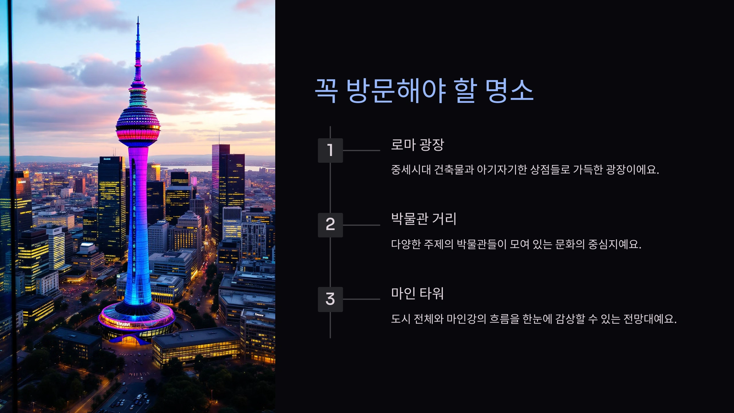 A1. 로마 광장, 마인 타워, 박물관 거리 등이 가장 유명한 명소로 꼽혀요. 각각의 명소마다 독특한 매력이 있어요.