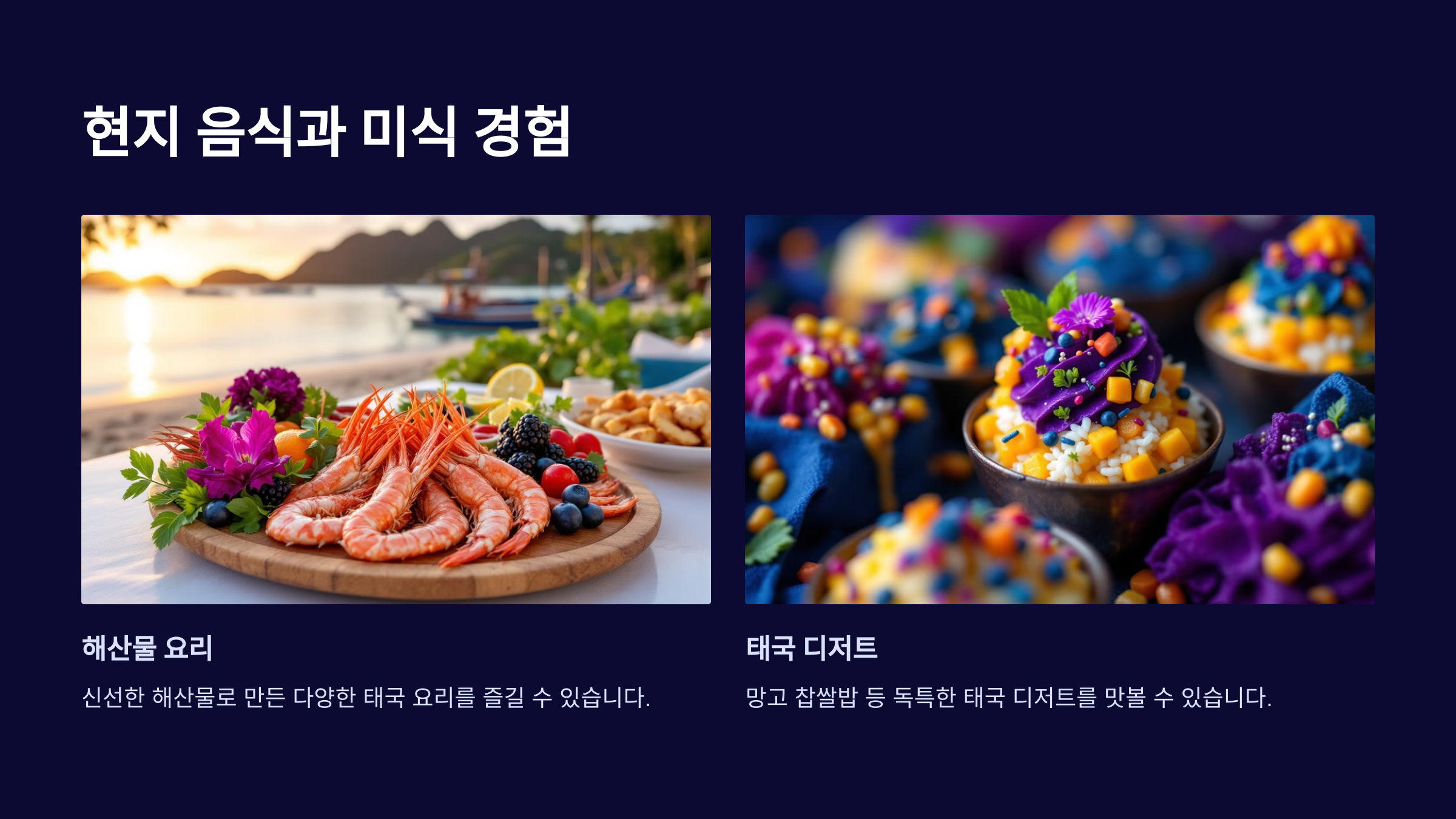 태국 특유의 향신료를 활용한 해산물 요리는 피피섬 여행에서 빠질 수 없는 즐거움입니다. 신선한 생선을 이용한 스파이시 생선 스튜는 특히 인기 있는 메뉴입니다.