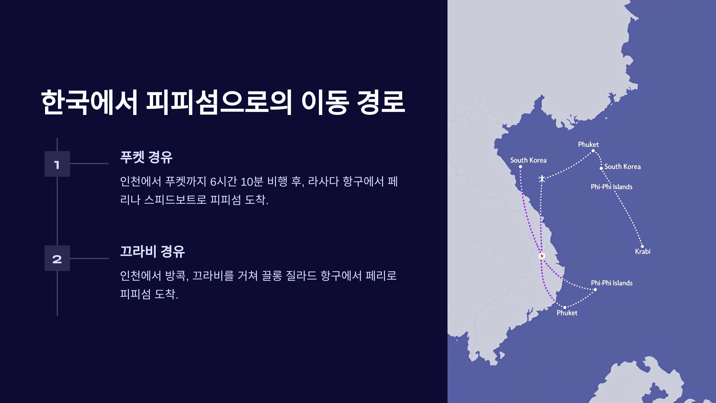 피피섬은 태국 남부 안다만해에 위치한 섬으로, 직접적인 항공편이 없어 주변 도시를 경유해야 합니다. 주요 경로는 푸켓 또는 끄라비를 통해 이동하는 방법입니다.