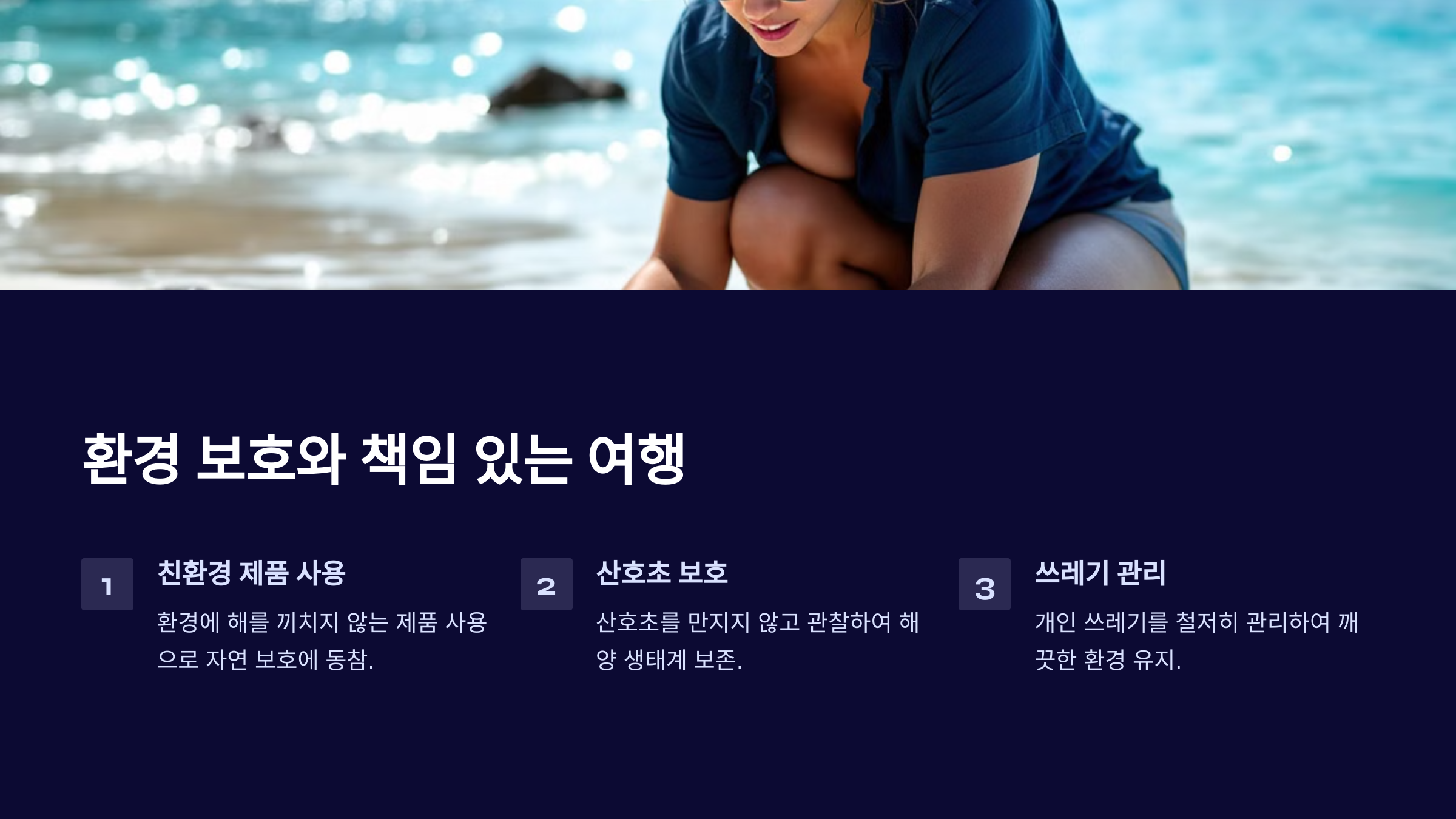 섬의 아름다움을 지속적으로 유지하기 위해 환경보호 규칙을 준수해야 합니다. 산호초를 만지거나 쓰레기를 버리는 행동을 피하고 자연을 존중하는 태도를 가져야 합니다.