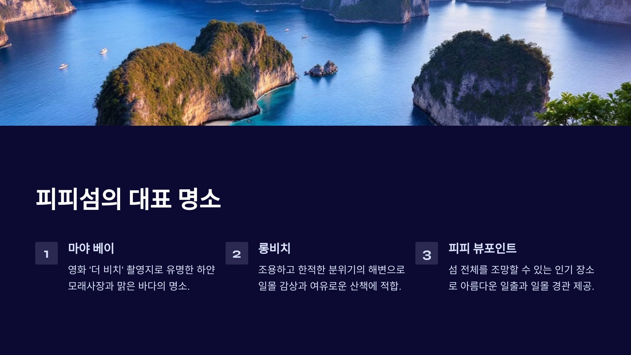 피피섬은 단순한 관광지가 아니라, 자연과의 조화를 이루며 마음속 깊은 곳까지 치유할 수 있는 힐링 여행지로 특별한 매력을 선사합니다.