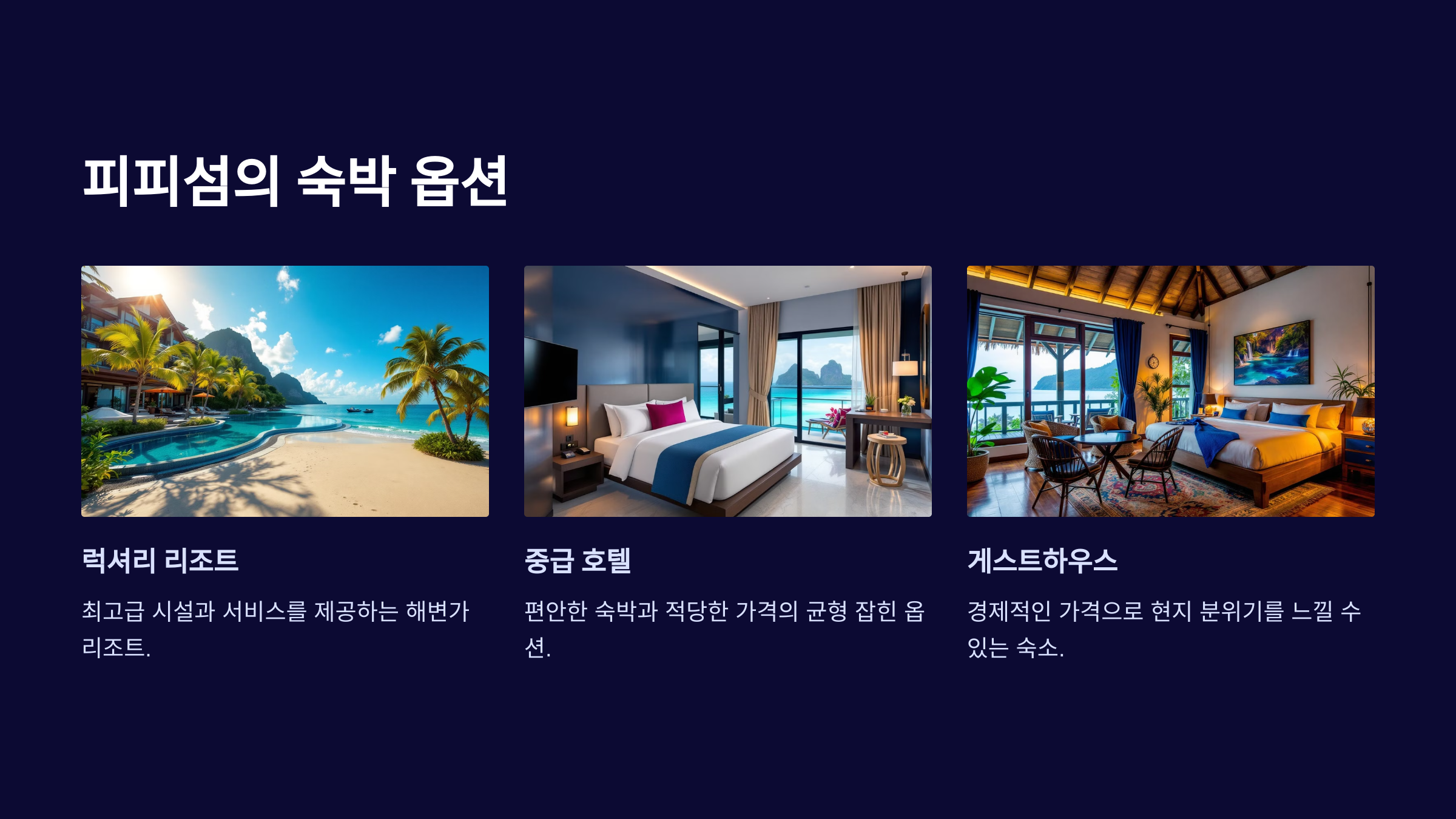 피피섬은 또한 다양한 숙박 시설과 현지의 맛있는 음식을 즐길 수 있어 여행의 만족도를 더욱 높여줍니다. 이곳에서 제공되는 리조트와 게스트하우스는 여행자의 취향과 예산에 맞게 선택할 수 있으며, 현지에서 직접 잡은 해산물 요리는 새로운 미식 경험을 선사합니다.
