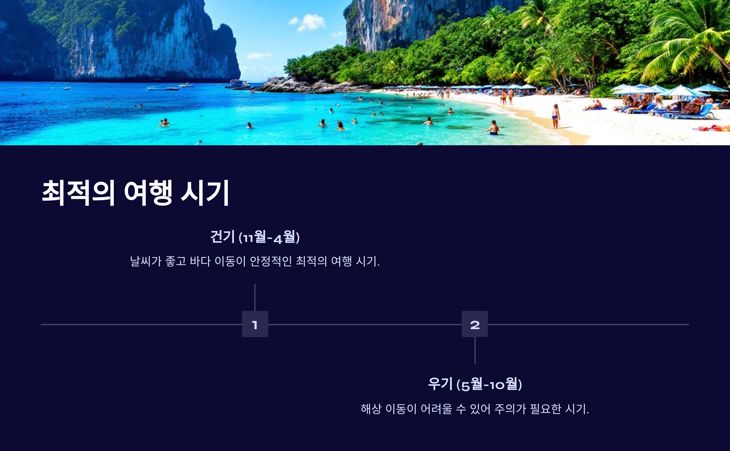 11월부터 4월까지가 피피섬을 방문하기 가장 좋은 시기입니다. 이 시기에는 날씨가 건조하고 바다가 잔잔해 여행하기 쾌적합니다.
