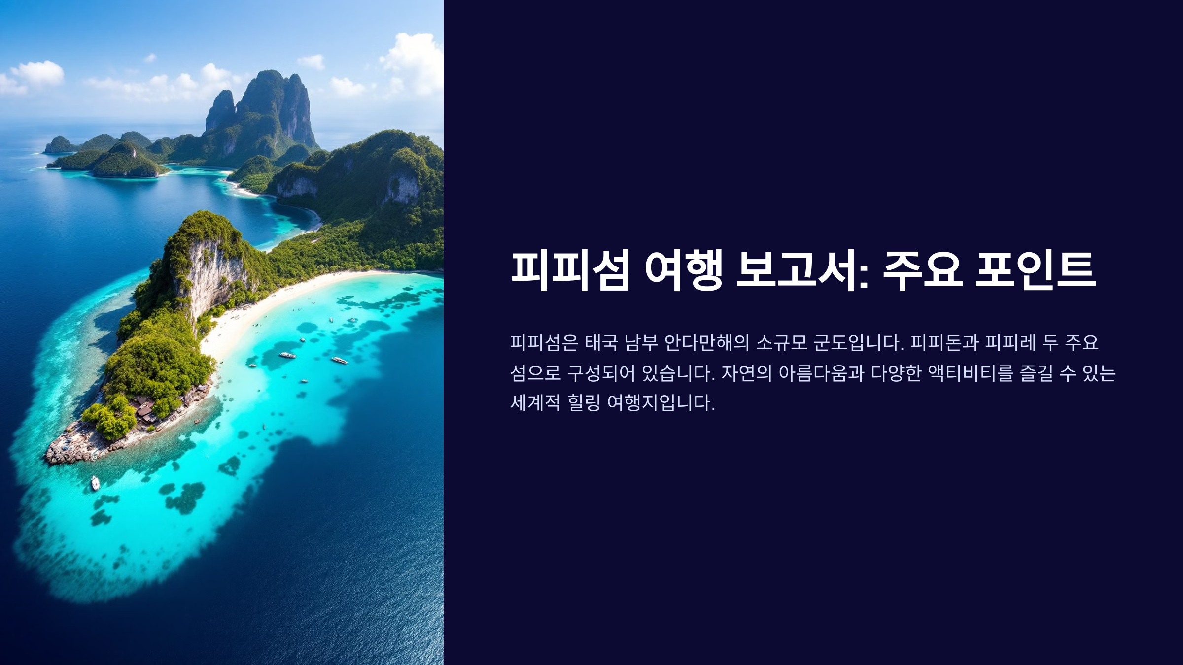 피피섬은 태국의 푸켓과 끄라비 사이에 자리 잡은 아름다운 군도로, 전 세계에서 자연을 사랑하는 여행자들이 찾는 인기 있는 힐링 여행지입니다. 이곳은 투명하게 빛나는 푸른 바다, 깨끗하고 부드러운 하얀 모래사장, 그리고 열대 지방 특유의 이국적인 풍경이 어우러져 있습니다.