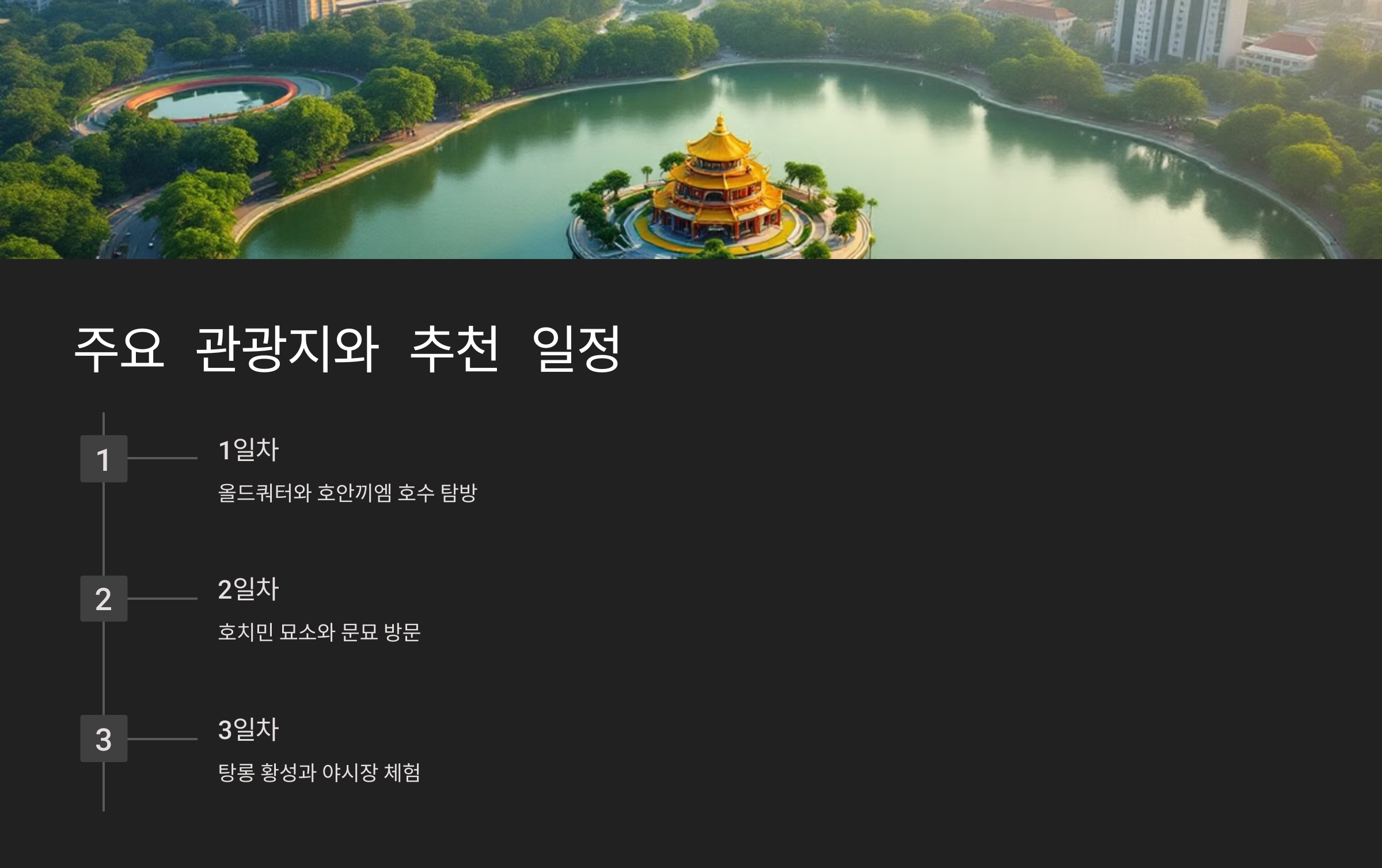 1일차: 도착 후 올드쿼터 산책 → 호안끼엠 호수와 응옥썬 사원 방문 → 쌀국수 저녁 식사