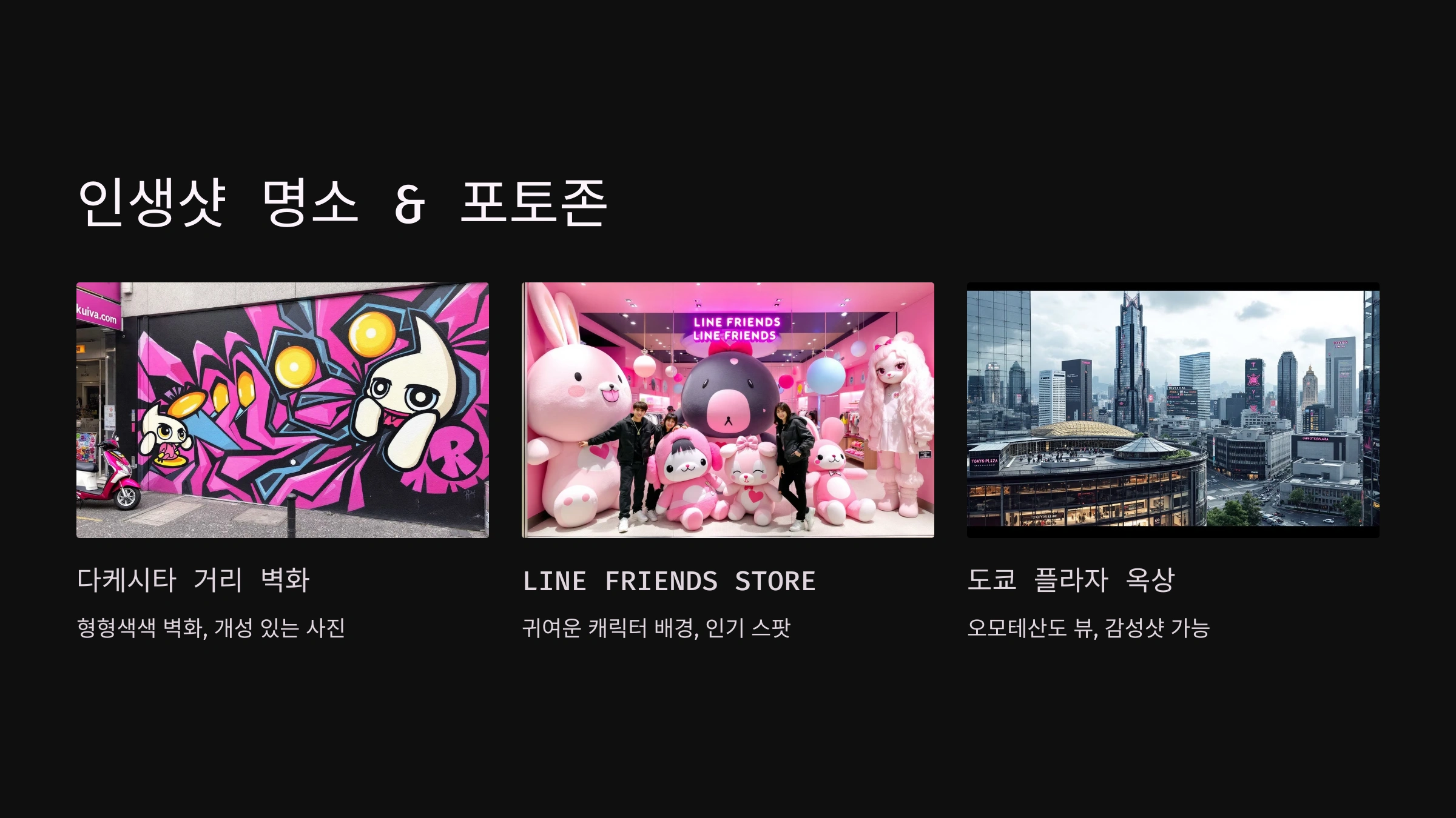 하라주쿠는 감각적인 사진을 찍기 좋은 곳들이 많아요! SNS에서 핫한 포토존들을 모아봤어요. 📷✨