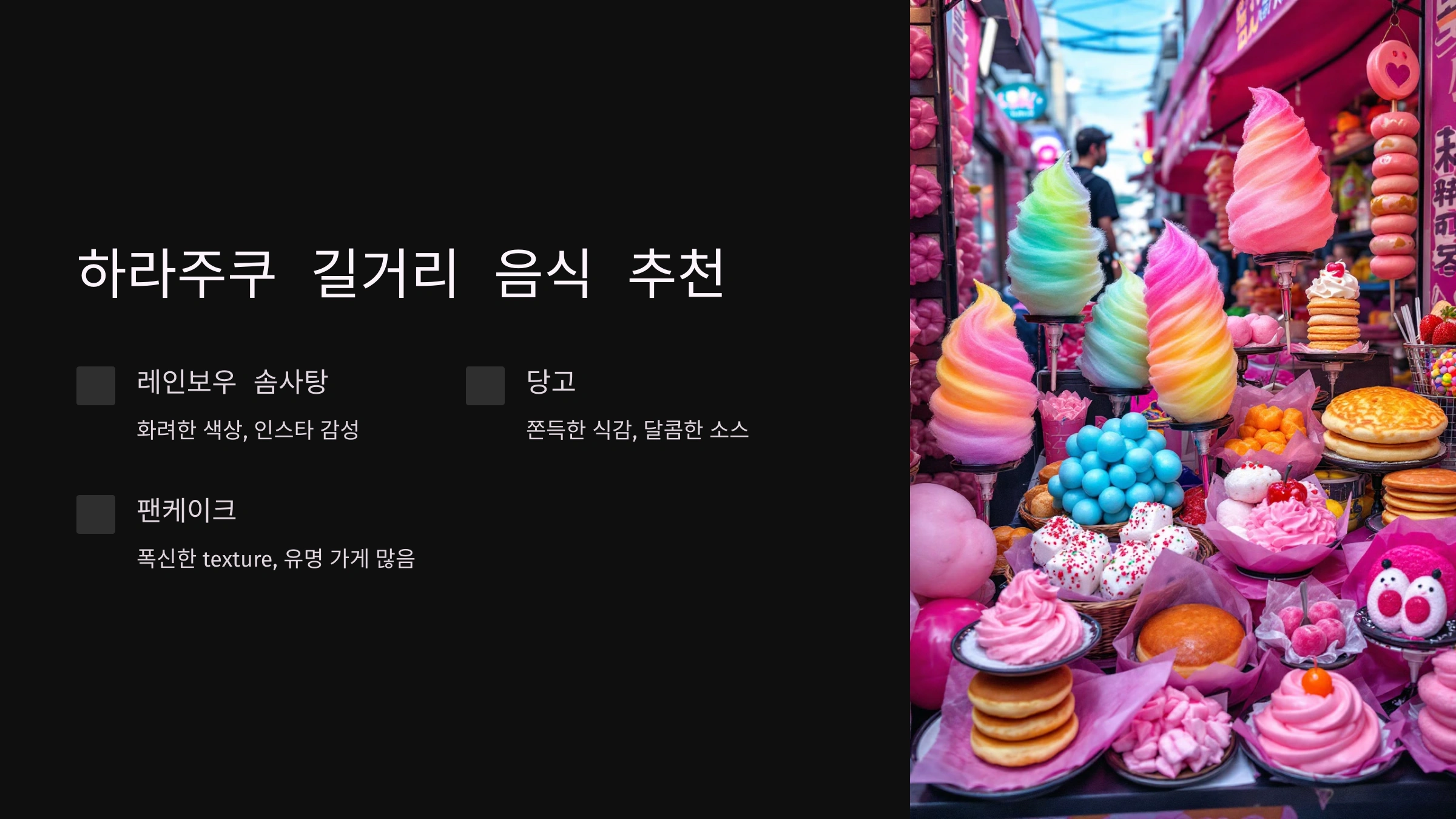 A2. 레인보우 솜사탕, 당고, 크레페, 팬케이크는 꼭 먹어보세요!