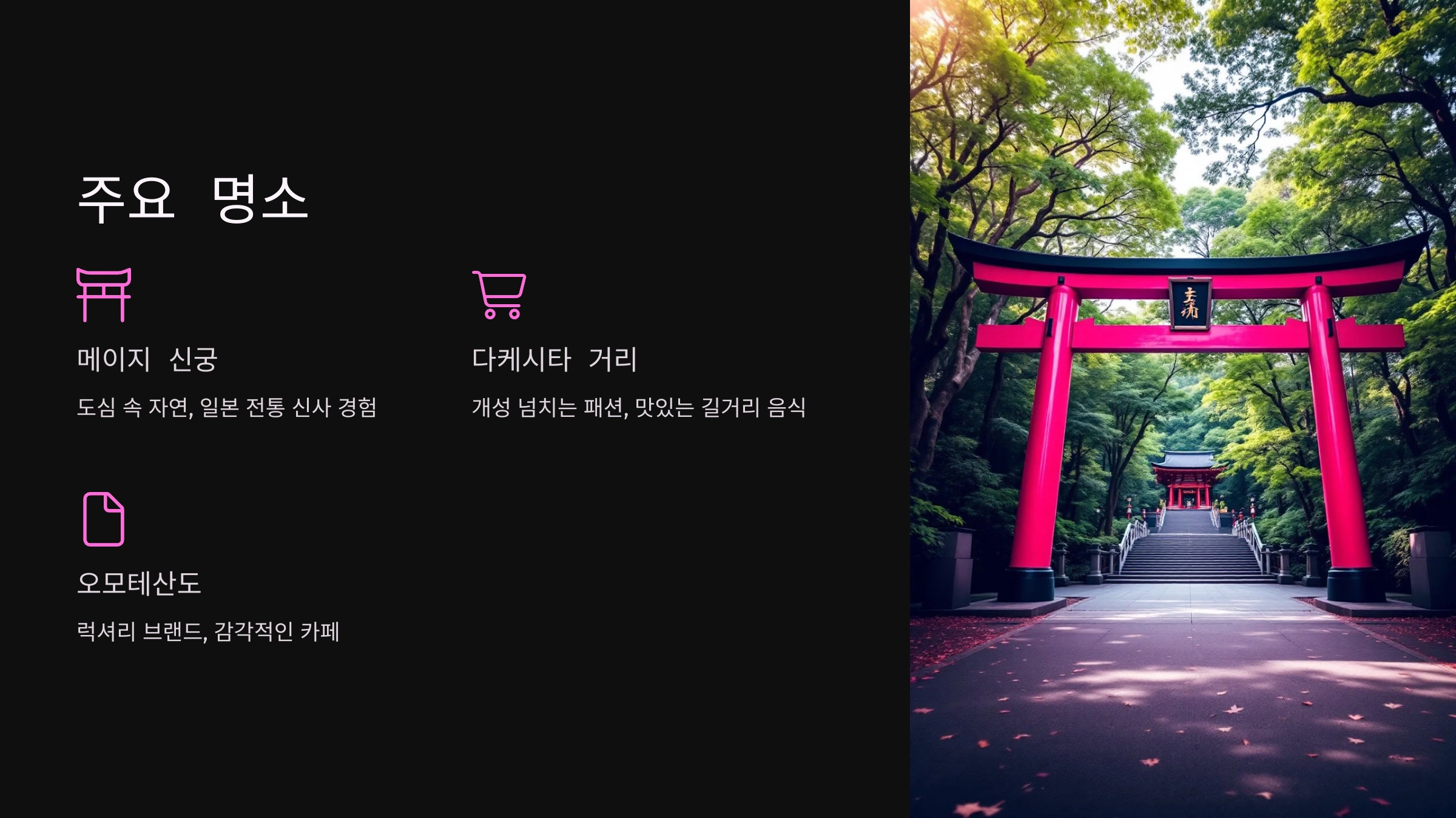 하라주쿠를 방문했다면 빼놓을 수 없는 명소들이 있어요! 이곳은 전통과 현대가 공존하는 곳으로, 다양한 볼거리와 즐길 거리가 가득하답니다. 대표적인 장소들을 소개할게요.