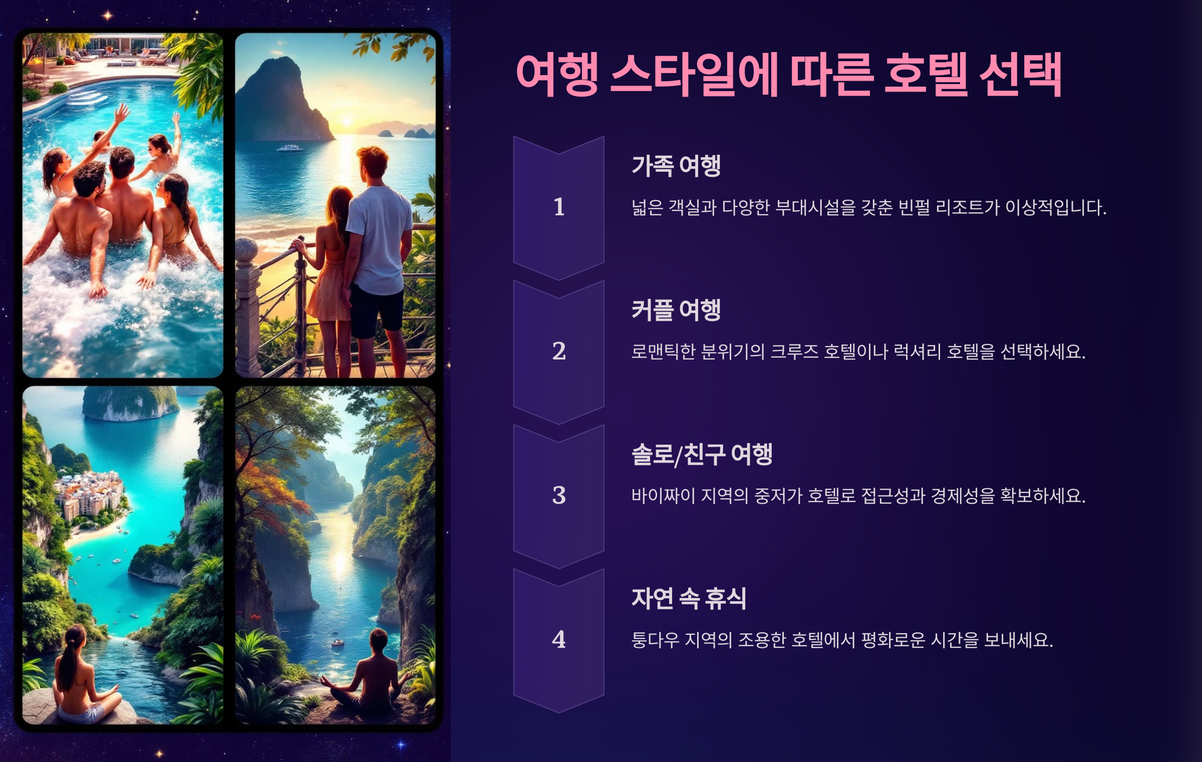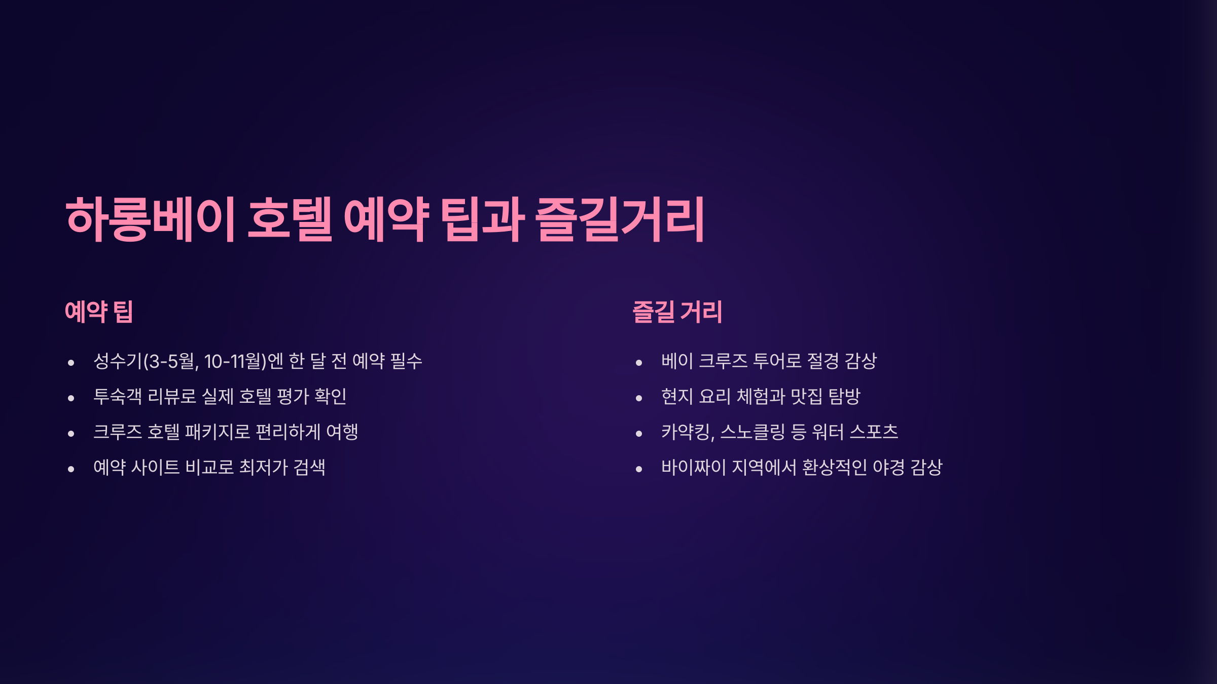 여행에서 숙소는 단순히 잠을 자는 장소 이상입니다. 하롱베이의 매력을 더욱 깊이 느끼기 위해 호텔을 신중히 선택하세요. 고급스러운 크루즈 경험부터 예산에 맞는 부티크 호텔까지, 다양한 옵션을 제공하는 하롱베이 호텔은 여행자마다 원하는 경험을 제공합니다.