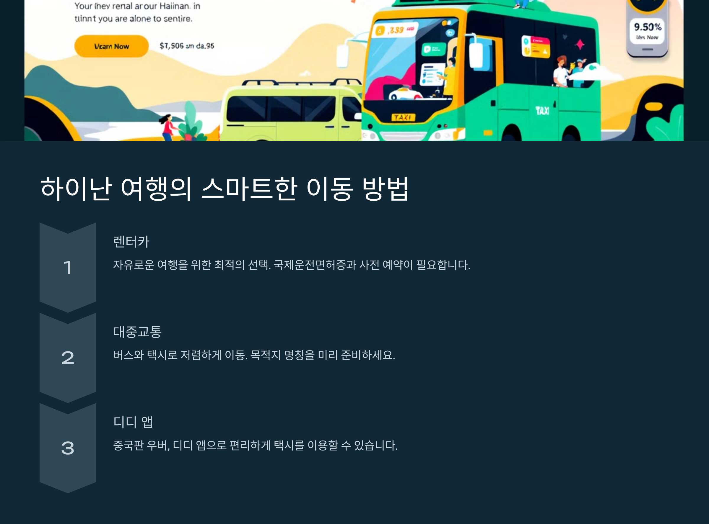 자유여행을 계획한다면 렌터카를 이용하는 것이 가장 편리합니다. 하이난은 도로 사정이 좋은 편이고, 관광지 간 거리가 다소 멀기 때문에 렌터카가 시간 절약에 도움이 됩니다. 국제운전면허증이 필요하며, 사전에 렌터카 업체를 통해 예약하세요.