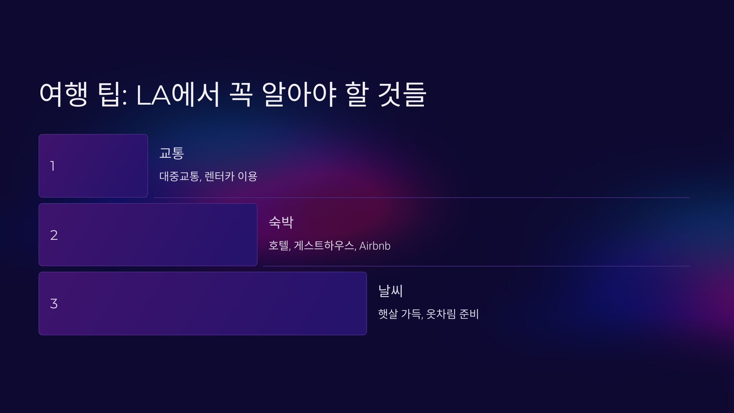 로스앤젤레스는 도시가 넓기 때문에 대중교통보다는 렌터카를 이용하는 것이 더 편리해요. 하지만 주차 비용이 비싼 경우가 많으니 미리 주차 가능 여부를 확인해두는 것이 좋아요.