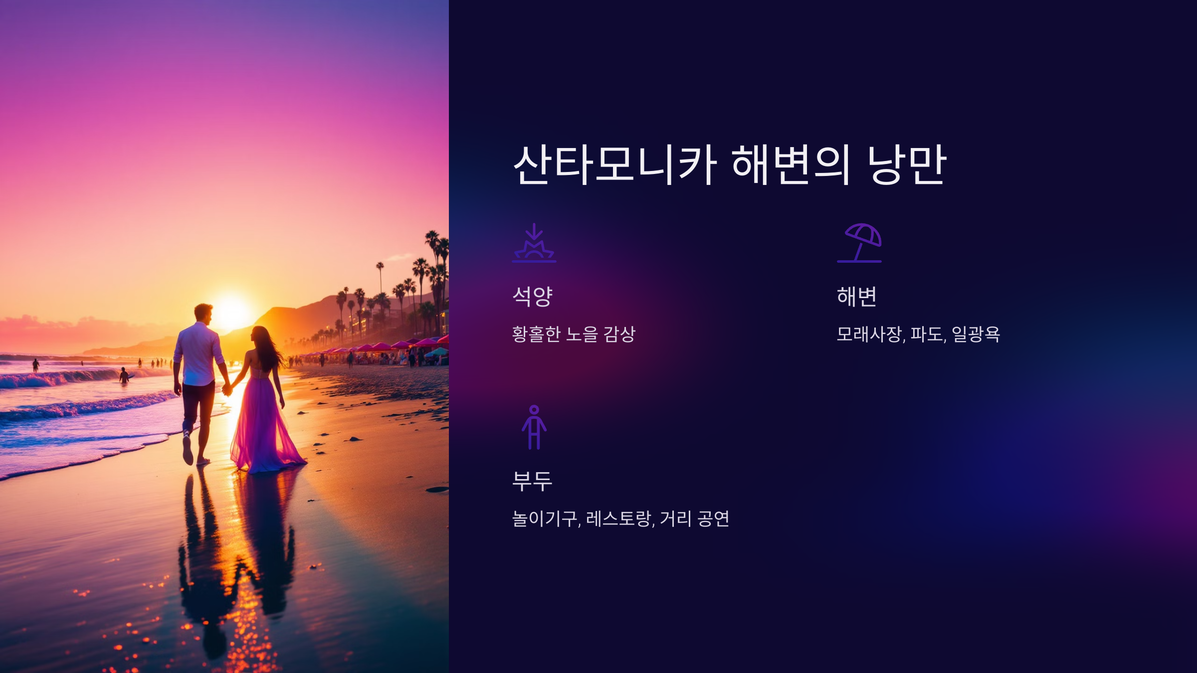 산타모니카 해변은 태평양의 아름다움을 한눈에 느낄 수 있는 곳이에요. 특히 산타모니카 피어는 로스앤젤레스의 상징적인 명소로, 대형 관람차와 다양한 놀이기구, 맛있는 음식점들이 즐비해 있어요. 이곳에서 노을을 감상하며 낭만적인 순간을 즐길 수 있답니다.