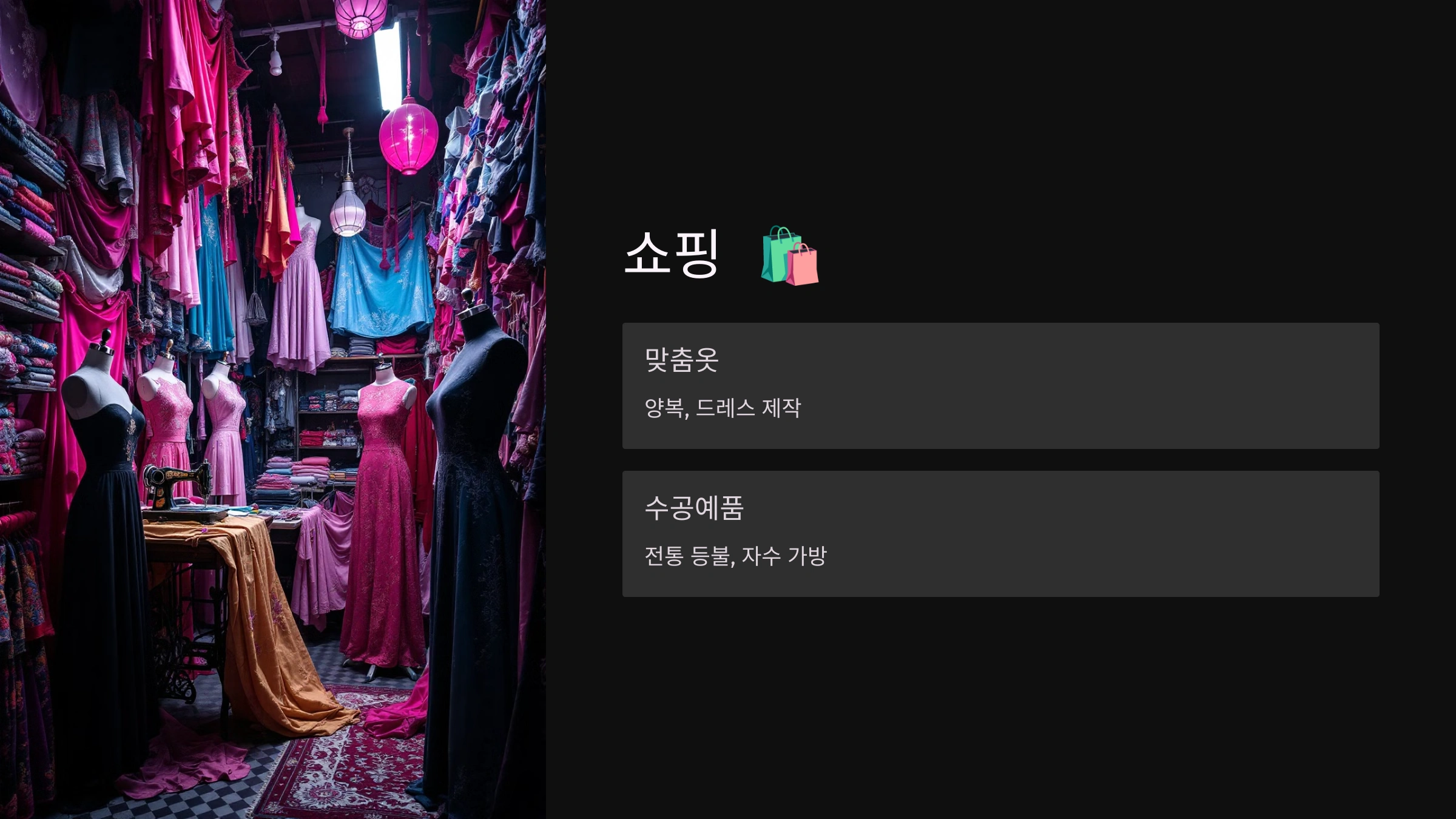 ✔️ 맞춤 제작 옷 (양복, 드레스, 린넨 셔츠 등)
