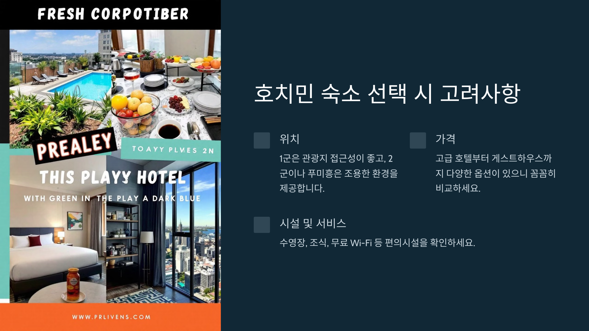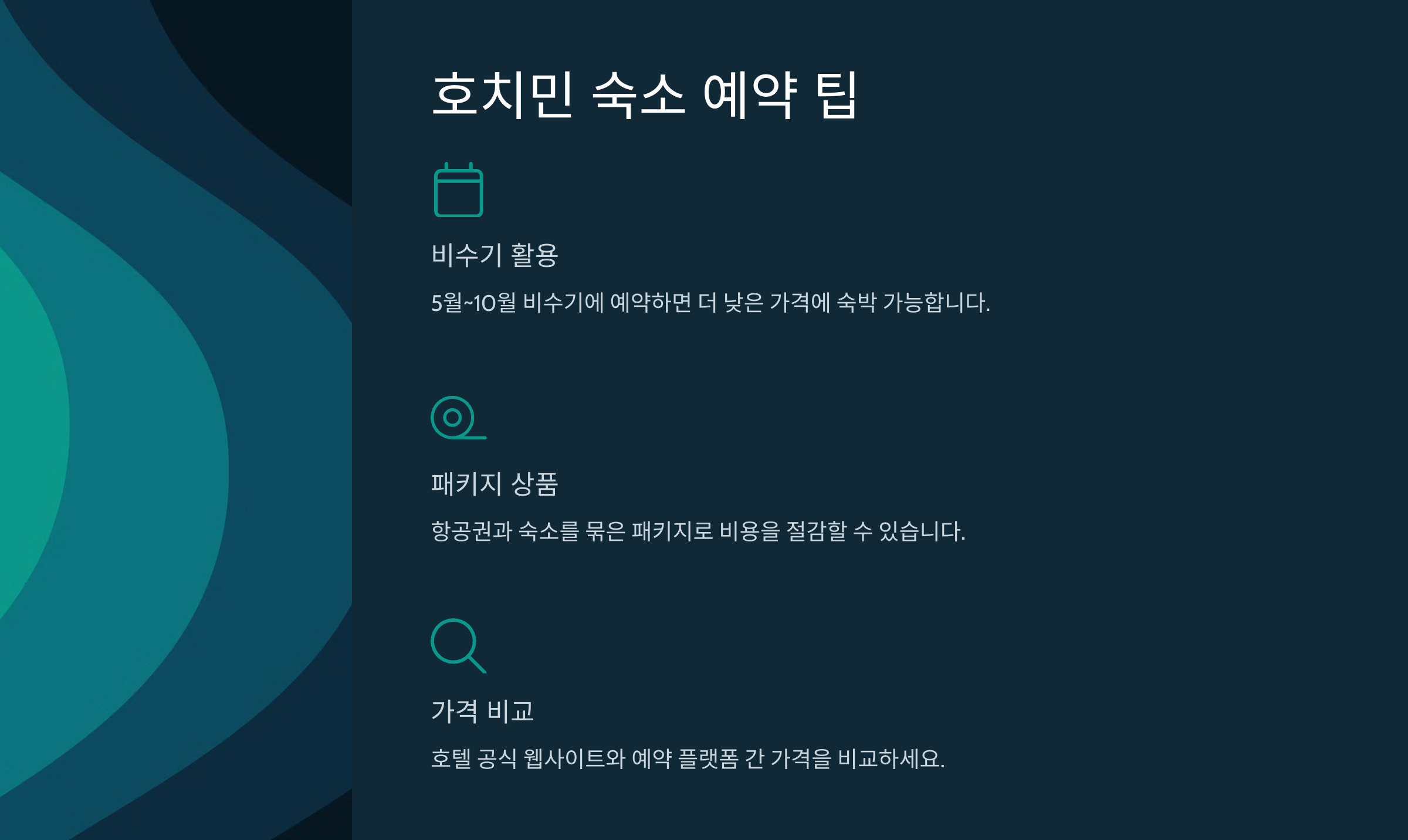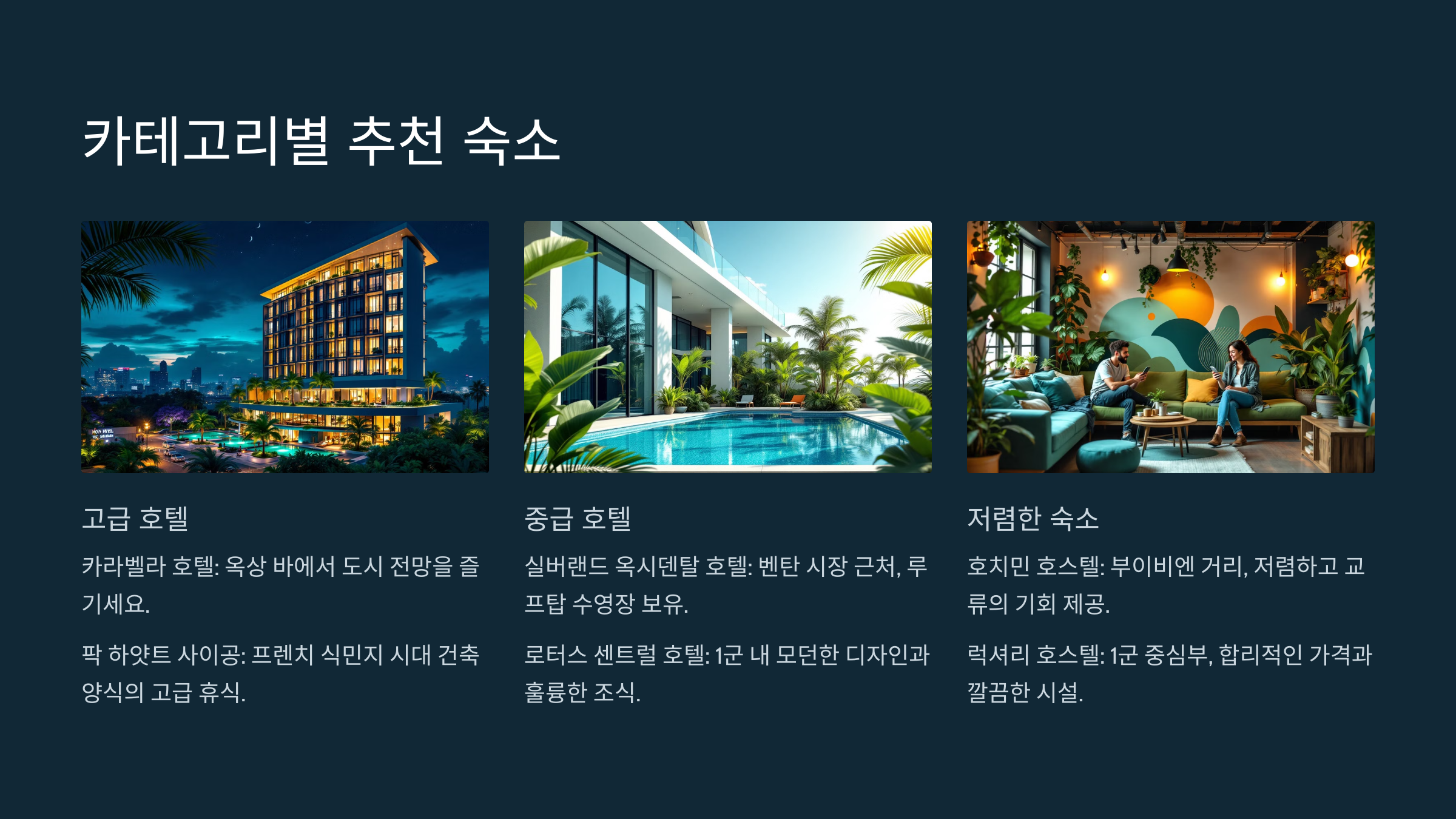 호치민은 고급 호텔부터 저렴한 게스트하우스까지 다양한 가격대를 자랑합니다. 예산에 맞는 옵션을 선택하되, 숙박비에 포함된 서비스와 시설을 꼼꼼히 살펴보는 것이 중요합니다.