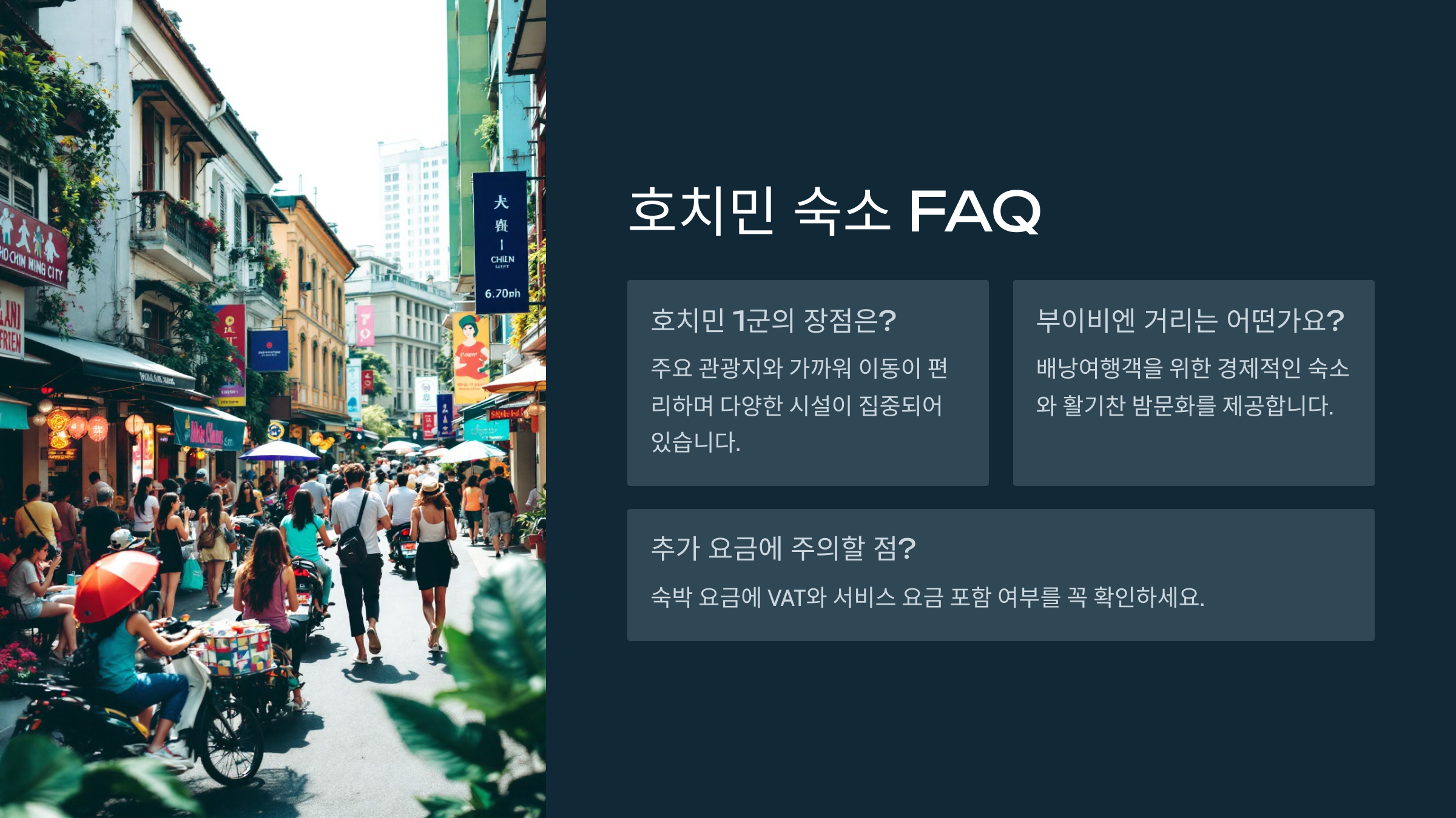 여행 일정에 따라 숙소 위치는 가장 중요한 요소 중 하나입니다. 대표적으로 1군(District 1)은 주요 관광지와 가깝고 교통이 편리해 여행객에게 인기가 많습니다. 반면, 더 조용하고 한적한 분위기를 원한다면 2군 또는 푸미흥 같은 지역을 고려해 보세요.