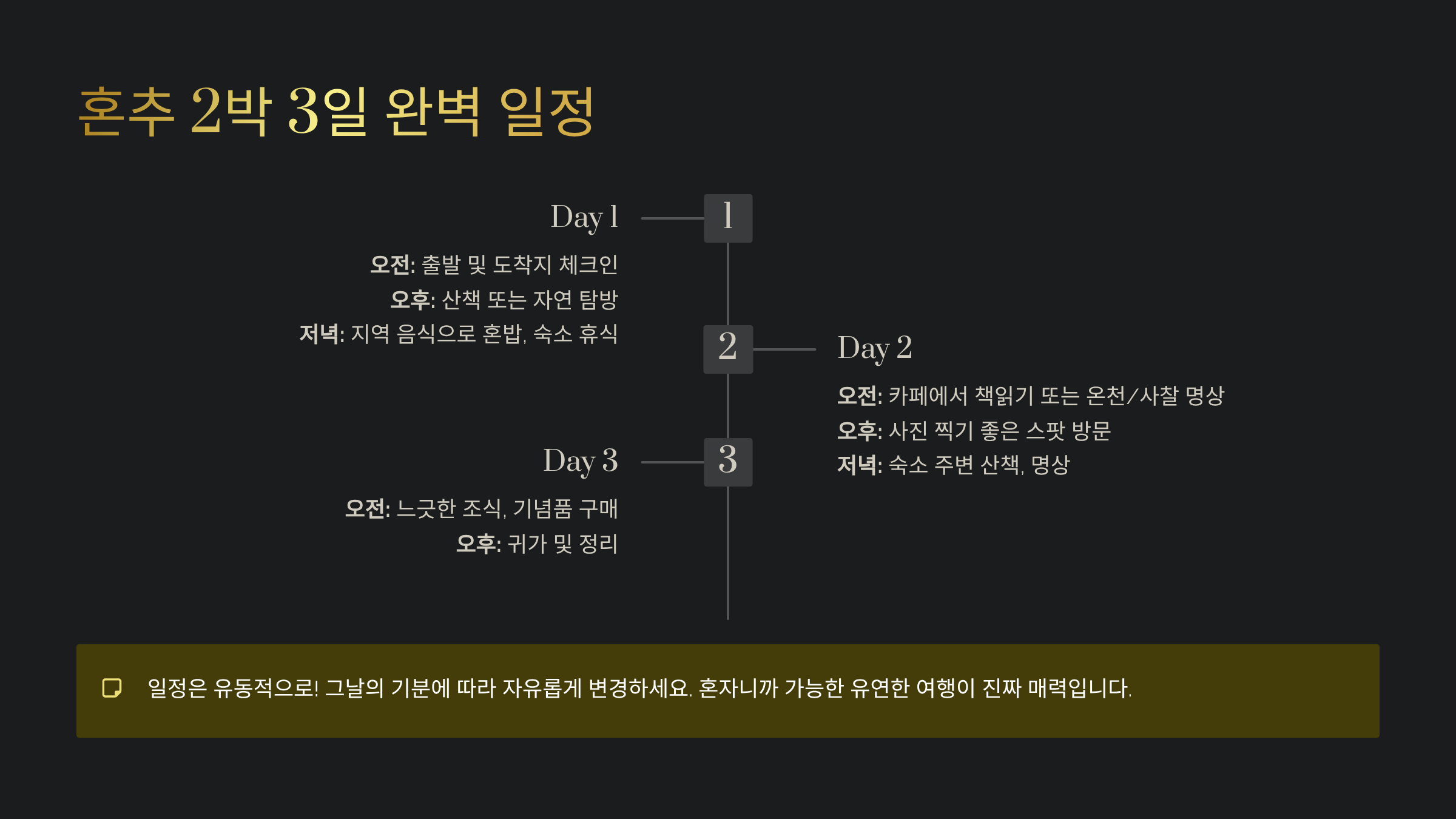 혼자 떠나는 여행은 일정이 유동적인 게 가장 큰 장점이에요. 하지만 대략적인 계획이 있다면 마음도 더 안정되고, 여유롭게 즐길 수 있답니다. 여기 혼추에 딱 맞는 2박 3일 코스를 지역별로 추천해볼게요! 🧭