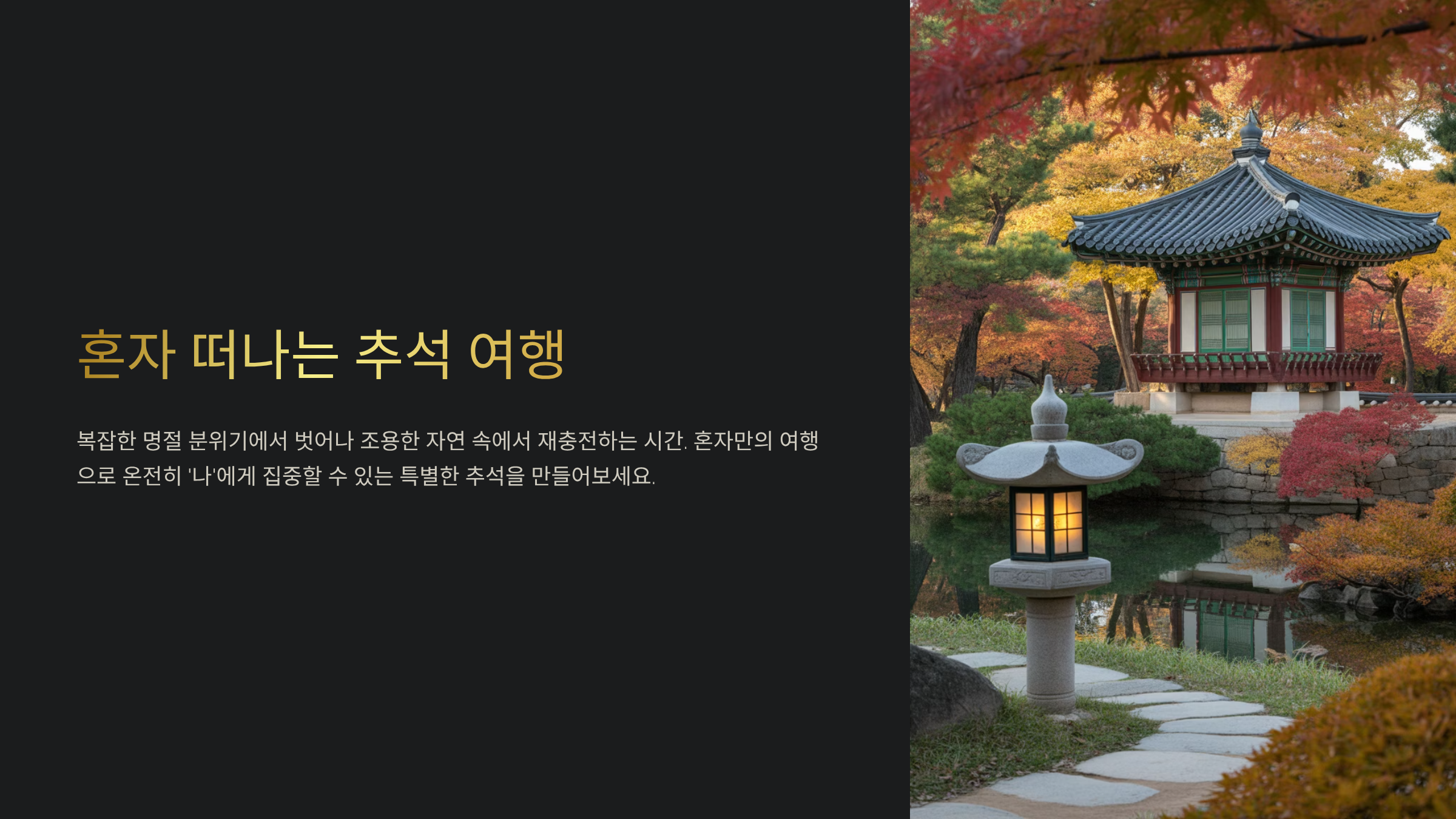 혼자 떠나는 추석 여행은 외로운 게 아니라, 오히려 가장 온전한 '나'를 만나는 시간이 될 수 있어요. 이번 명절엔 사람 대신 풍경과 대화를 나눠보는 건 어떨까요? 🌄