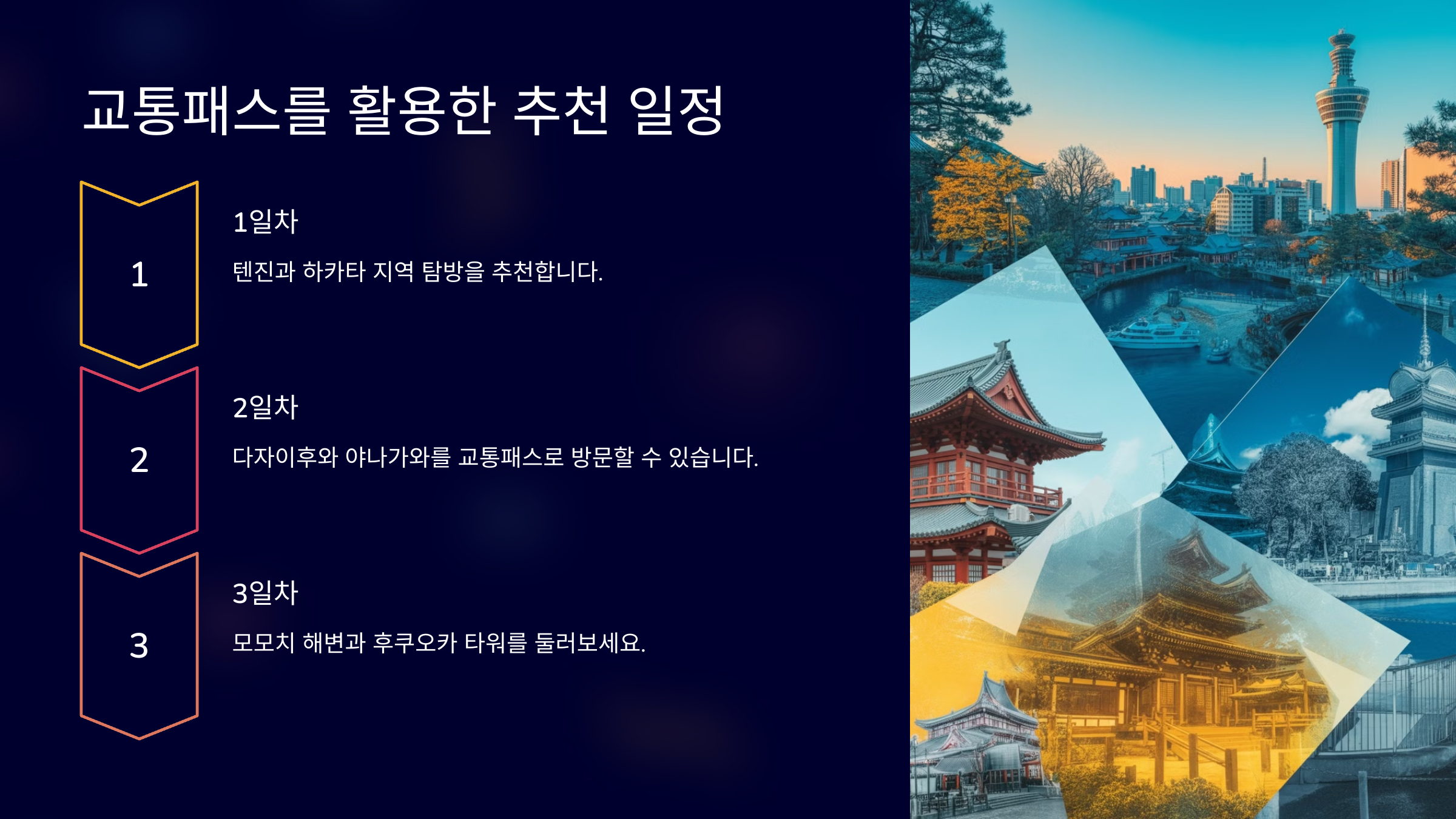 후쿠오카는 일본의 남서부에 위치한 인기 있는 여행지로, 맛있는 음식, 다양한 쇼핑, 그리고 아름다운 자연경관이 조화를 이루고 있습니다. 특히 한국에서 접근성이 좋아 가성비 좋은 여행지로