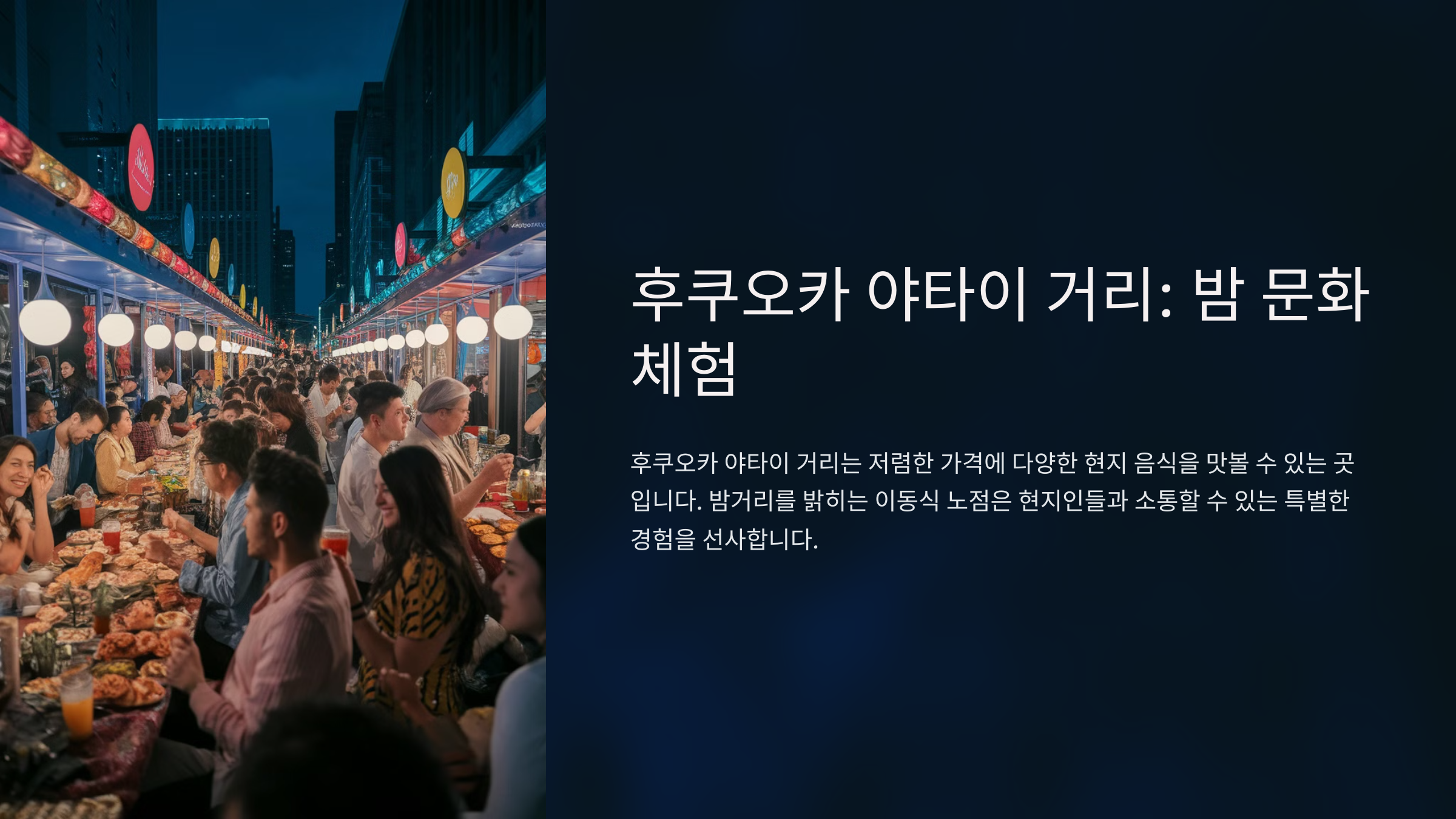 후쿠오카 야타이 거리는 이동식 노점들로 구성된 독특한 거리입니다. 저녁이 되면 활기를 띠며, 저렴한 가격에 다양한 음식을 즐길 수 있어 현지인과 관광객 모두에게 사랑받는 곳입니다. 또한, 소규모 공간에서 현지인들과 대화를 나누며 특별한 추억을 만들기에 좋은 장소입니다.