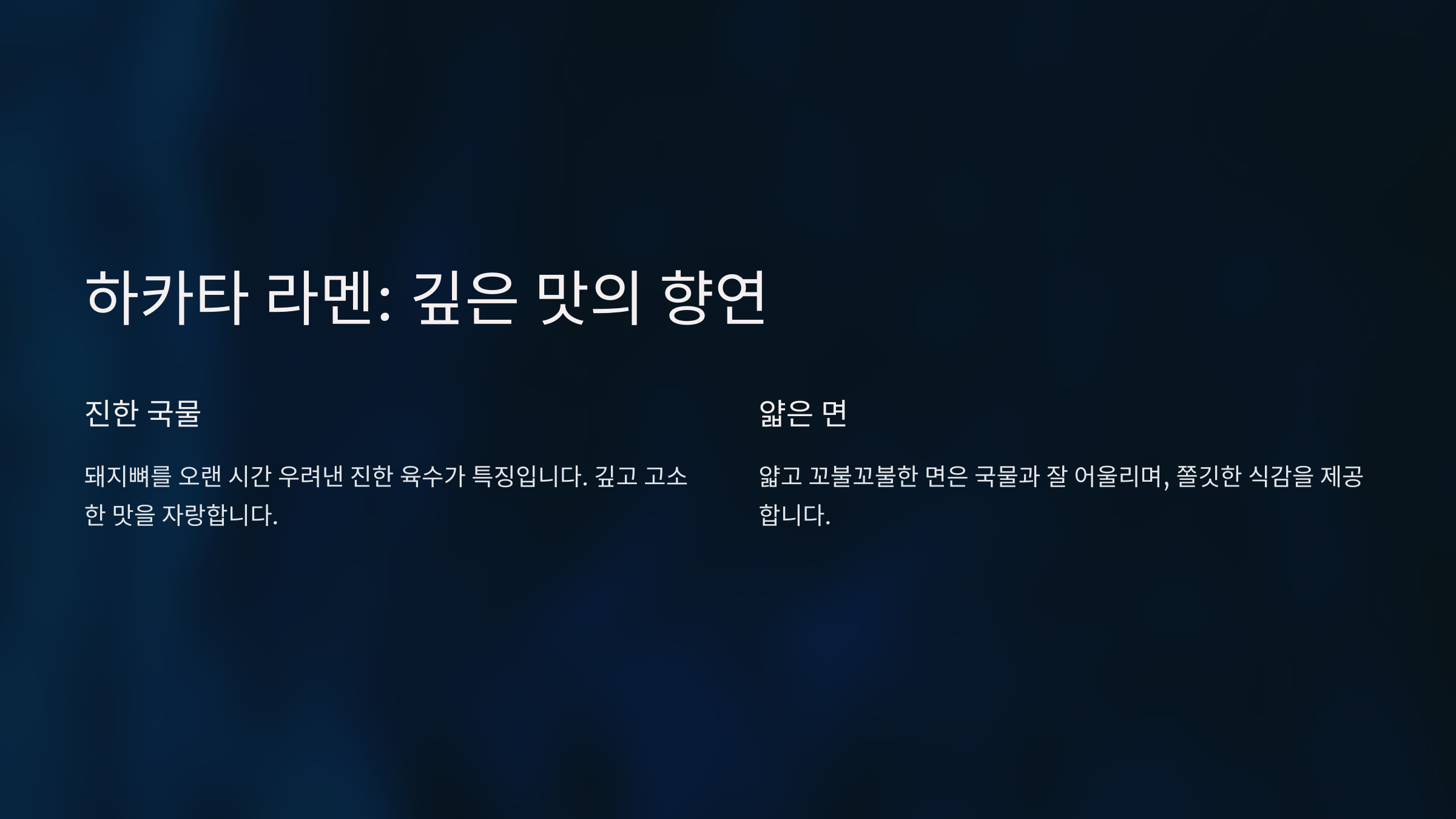 하카타 라멘은 후쿠오카를 대표하는 음식으로, 돼지뼈를 오랜 시간 우려낸 진한 톤코츠 국물이 매력적인 라멘입니다. 얇은 면발은 국물과 완벽하게 어우러지며, 진하고 고소한 풍미가 식욕을 돋웁니다. 특히 하카타 라멘의 깊은 국물 맛은 일본 내 다른 지역의 라멘과는 차별화된 특징을 가지고 있습니다.